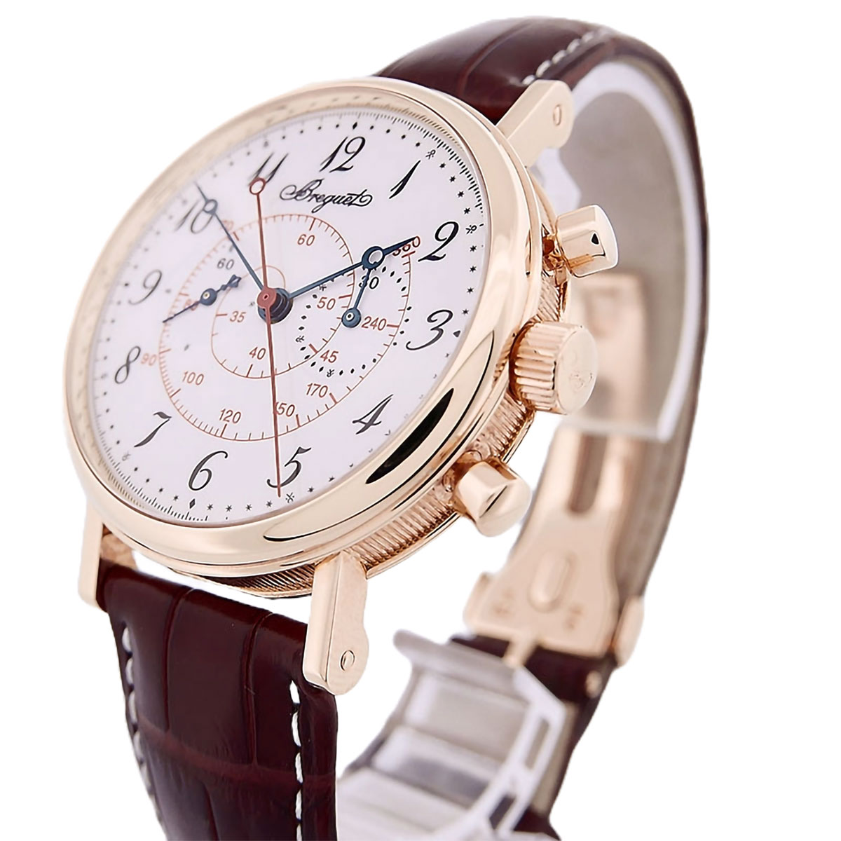 The Breguet Classique Chronograph 5247BR299V6 embodies the timeless elegance and perfect craftsmanship of the traditional Breguet company. This mechanical masterpiece presents itself as a synthesis of classic design and the highest art of watchmaking in a refined red gold case with a diameter of 39 mm.