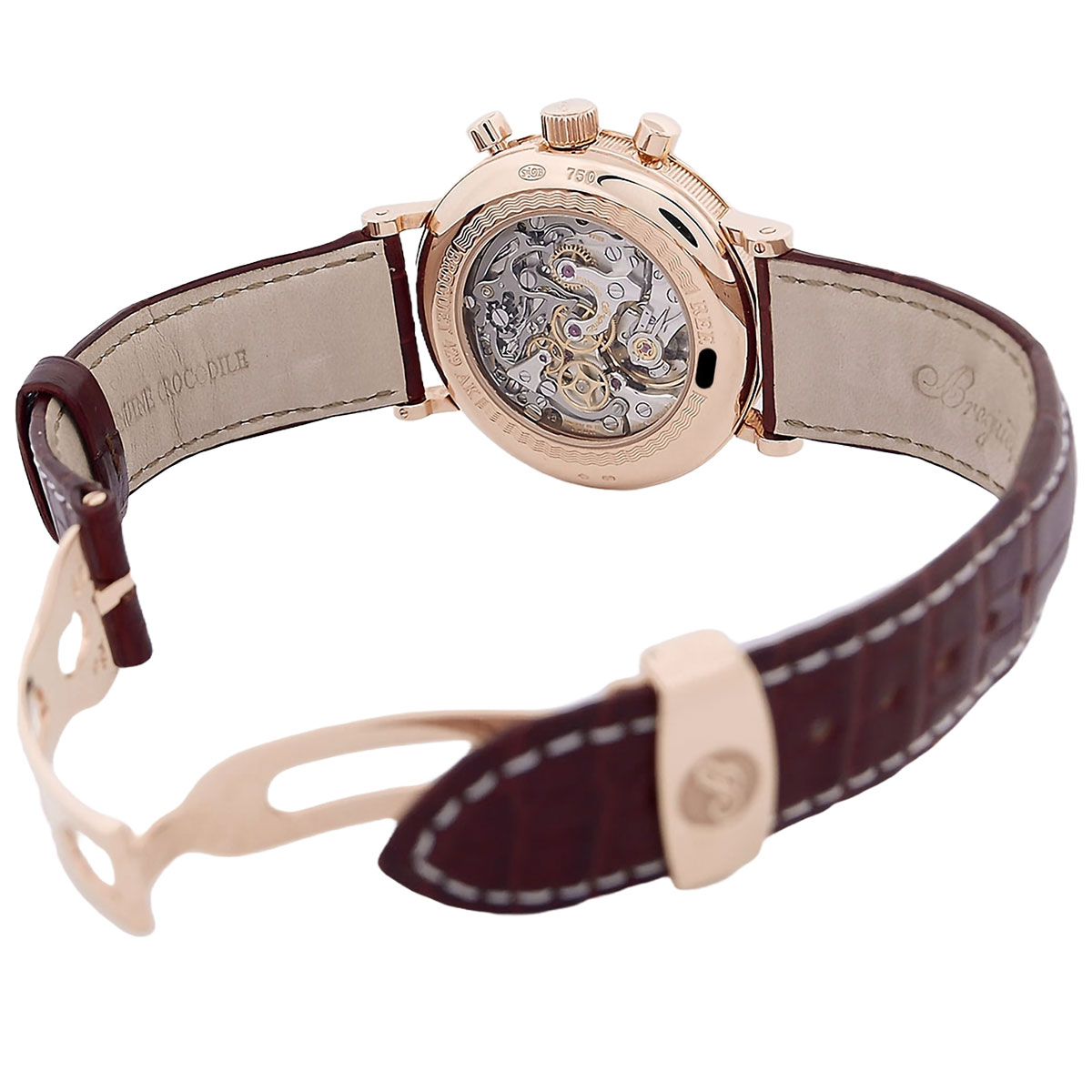 The 18-carat red gold case is protected by sapphire crystals on the front and back and is water-resistant to 30 meters. With a height of 12.1 mm, the watch sits comfortably on the wrist. The brown crocodile leather strap with original red gold folding clasp underlines the luxurious character of this exceptional watch.