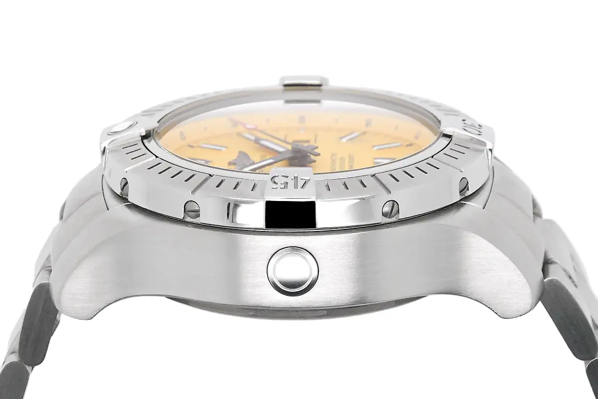 The dial in Cobra Yellow is the unique visual feature of this model and ensures maximum readability under water as well as a striking presence on land. Large indices and hands coated with Super-LumiNova in a „stencil“ design correspond with the technical orientation of the Avenger line. The robust Professional III stainless steel bracelet is fitted with a safety folding clasp with fine adjustment. Despite its functional orientation, the case has a high-quality finish with precise chamfers and satin-finished surfaces.