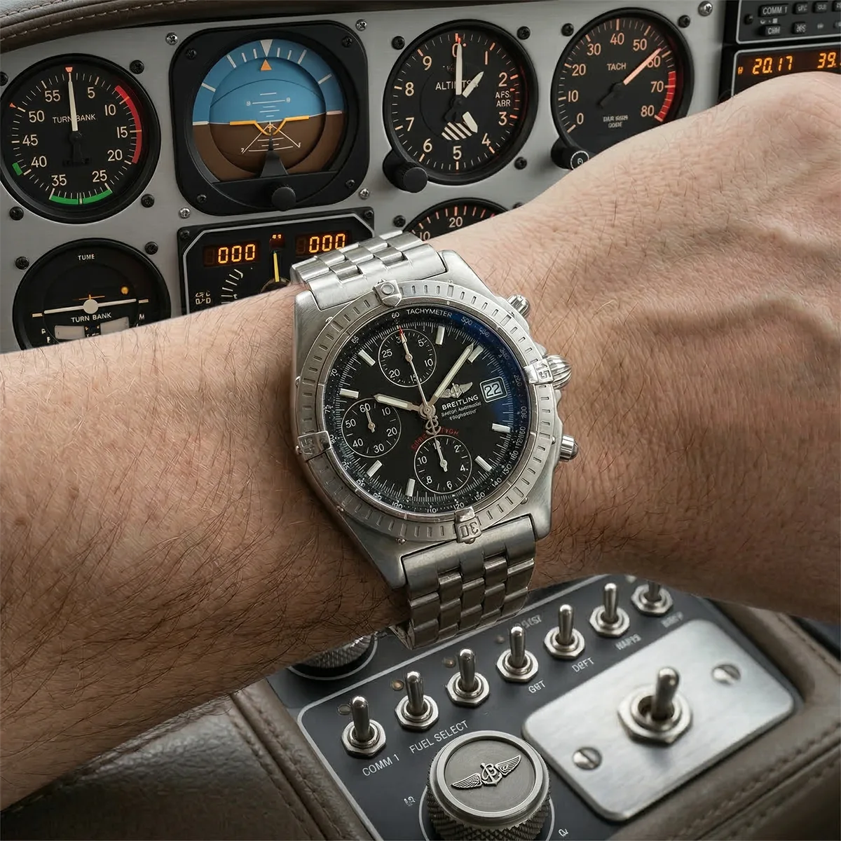 The Reference A13350 represents the uncompromising tool watch interpretation of the Chronomat design language. In contrast to the often highly polished sister models of the 90s, the Blackbird due to their full-surface Satin finish of the 39 mm Stainless steel-housing. This „stealth“ look absorbs reflections and underlines the military aspirations of the „Serie Speciale“. The characteristic rotating bezel with the four applied Riders at 3, 6, 9 and 12 o'clock ensures a non-slip feel and protects the anti-reflective sapphire crystal. The matt black dial with the red „Serie Speciale“ lettering offers maximum contrast to the tritium-coated indices and hands, which can display authentic ageing.