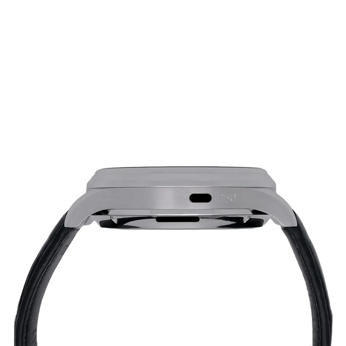 The housing in 950 platinum measures 44.2 mm in diameter with an overall height of 15.5 mm. The characteristic design with flat bezel and screw-down sapphire crystal case back provides an insight into the fine finishing of the 50611 caliber. The double moon phase display at 12 o'clock is one of the most precise of its kind with a deviation of just one day in 577.5 years. The black alligator leather strap with Platinum folding clasp completes the appearance. The waterproofness of 3 ATM clearly positions the watch as a haute horlogerie dress watch.