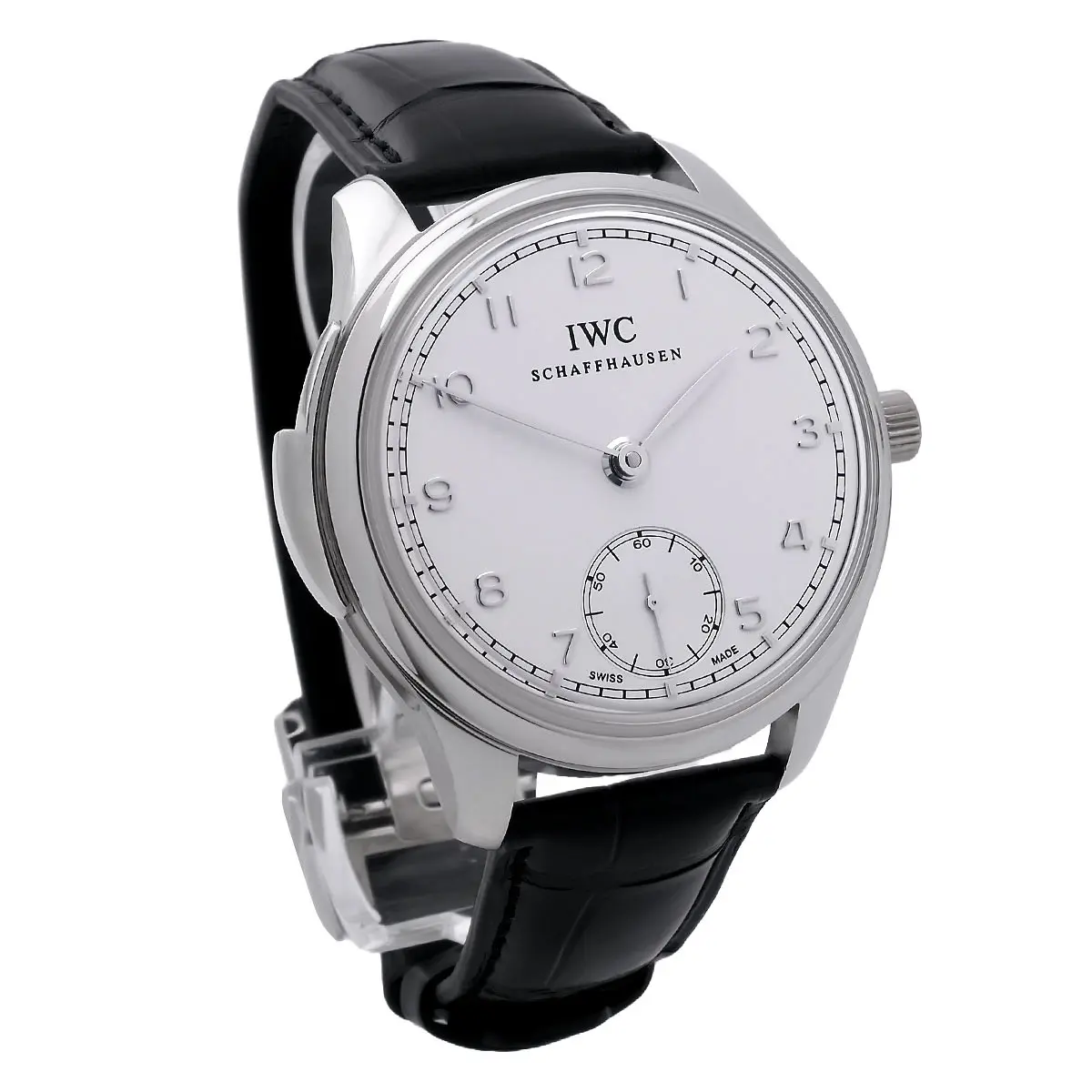 The diameter is 44 mm, which gives the watch a present yet elegant appearance. The watch has a mechanical hand-wound movement with minute repeater, one of the most complex and sought-after complications in the art of watchmaking. IWC caliber 98950, 52 rubies, 46 h power reserve, 18,000 A/h. The dial is light in color and features applied Arabic numerals. The polished hands contribute to the clear and elegant aesthetics. In addition to the time display, the watch features a minute repeater that allows the wearer to read the time acoustically by striking two gongs. A black crocodile leather strap with a 950 platinum folding clasp ensures a secure and comfortable fit on the wrist.