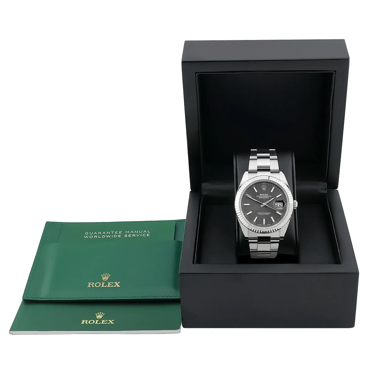 The present Reference 126334 represents the modern evolution of the classic Datejust DNA. The 41 mm case made of Stainless steel Oystersteel impresses with its striking presence on the wrist without losing its traditional elegance. Particularly noteworthy is the Fluted bezel in 18-carat white gold, whose precisely cut facets create an extraordinary play of light. The dial in slate gray with a sunray finish lends the timepiece a subtle depth, which is accentuated by the applied indices with Chromalight luminous material is perfectly complemented. The flanks of the housing feature sharp lines with excellent Polish which underlines the high manufacturing standard of the manufactory.