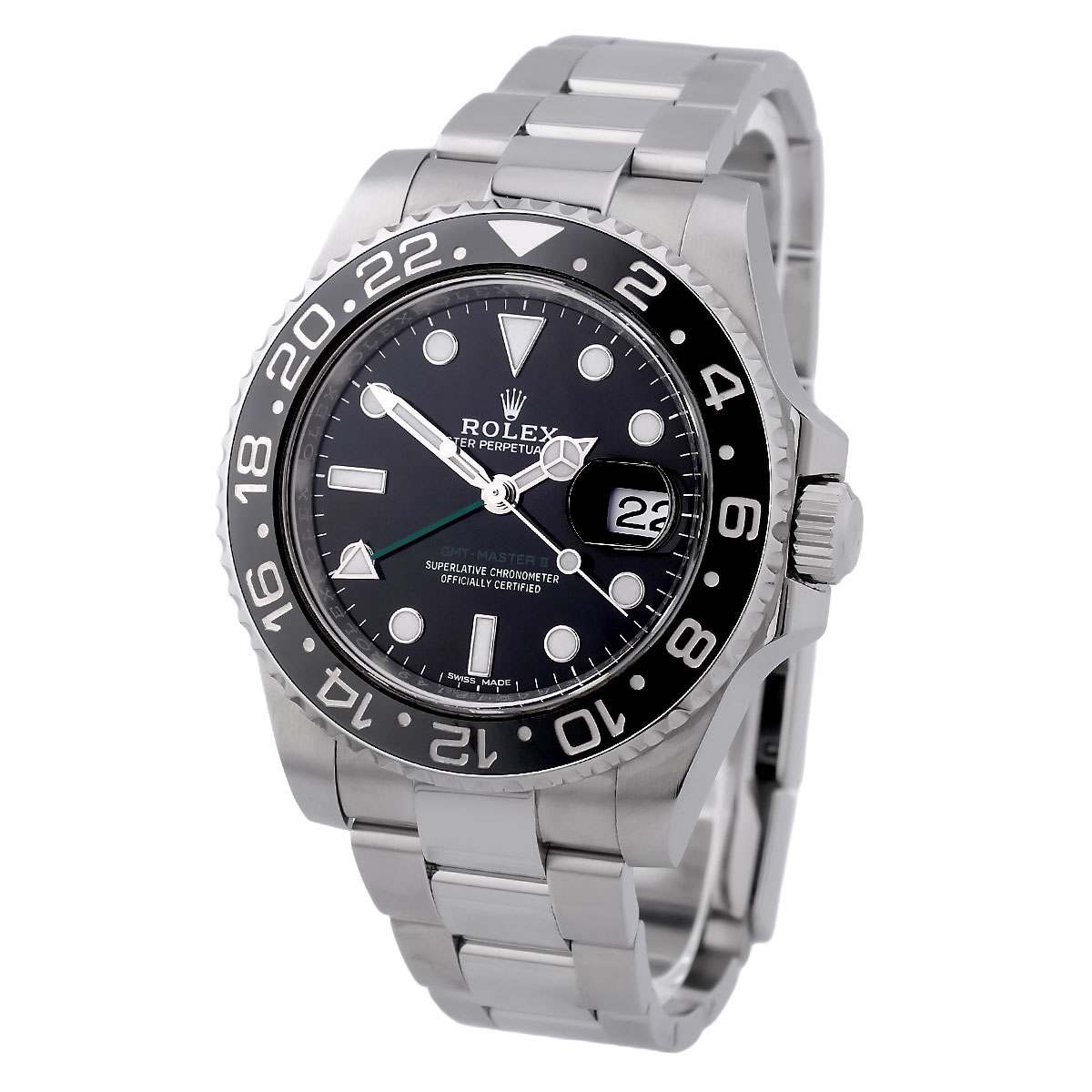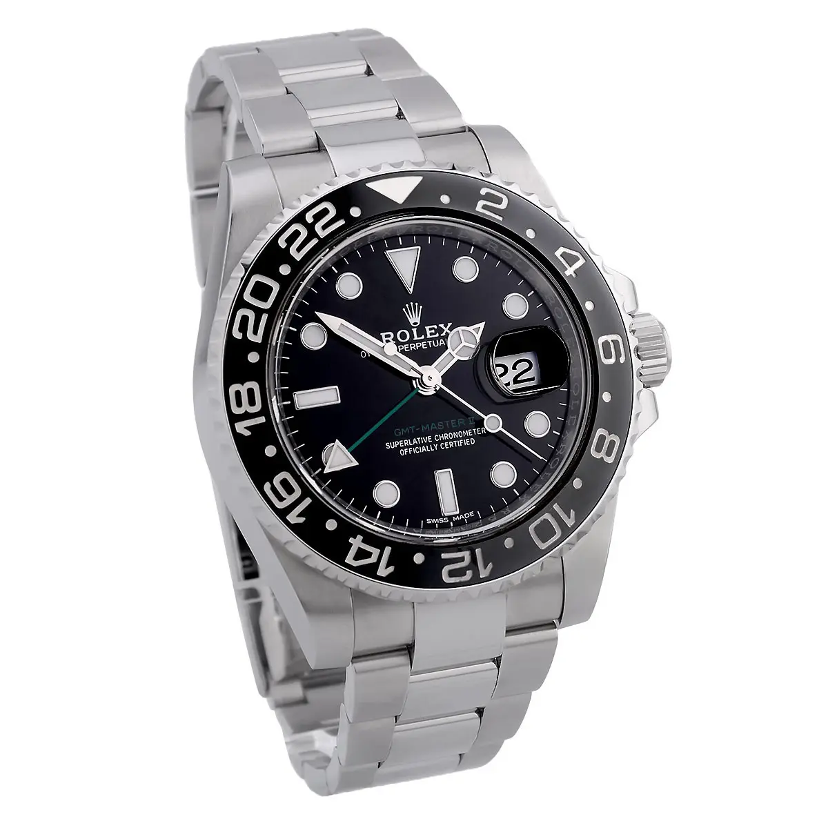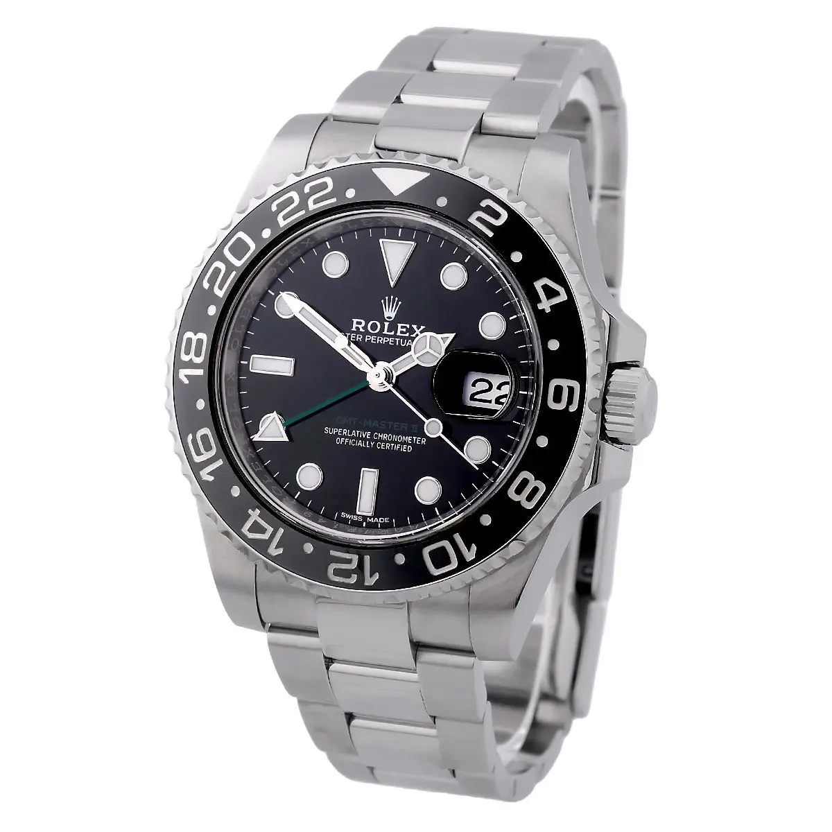 A special feature of the ROLEX GMT-Master II is the combination of style and functionality. The black dial elegantly accentuates the appealing design in combination with the green GMT hand. This color combination is indeed very practical, as it ensures clear legibility under various lighting conditions and is also pleasing to the eye. In addition, the case is made entirely of solid stainless steel, which makes the watch extremely lightweight and hard-wearing. The bezel is finished in a striking black. It allows the second time zone to be set fairly accurately. Whether for business or leisure, this balanced liaison of aesthetics and functionality makes the GMT-Master II an ideal option for any occasion.