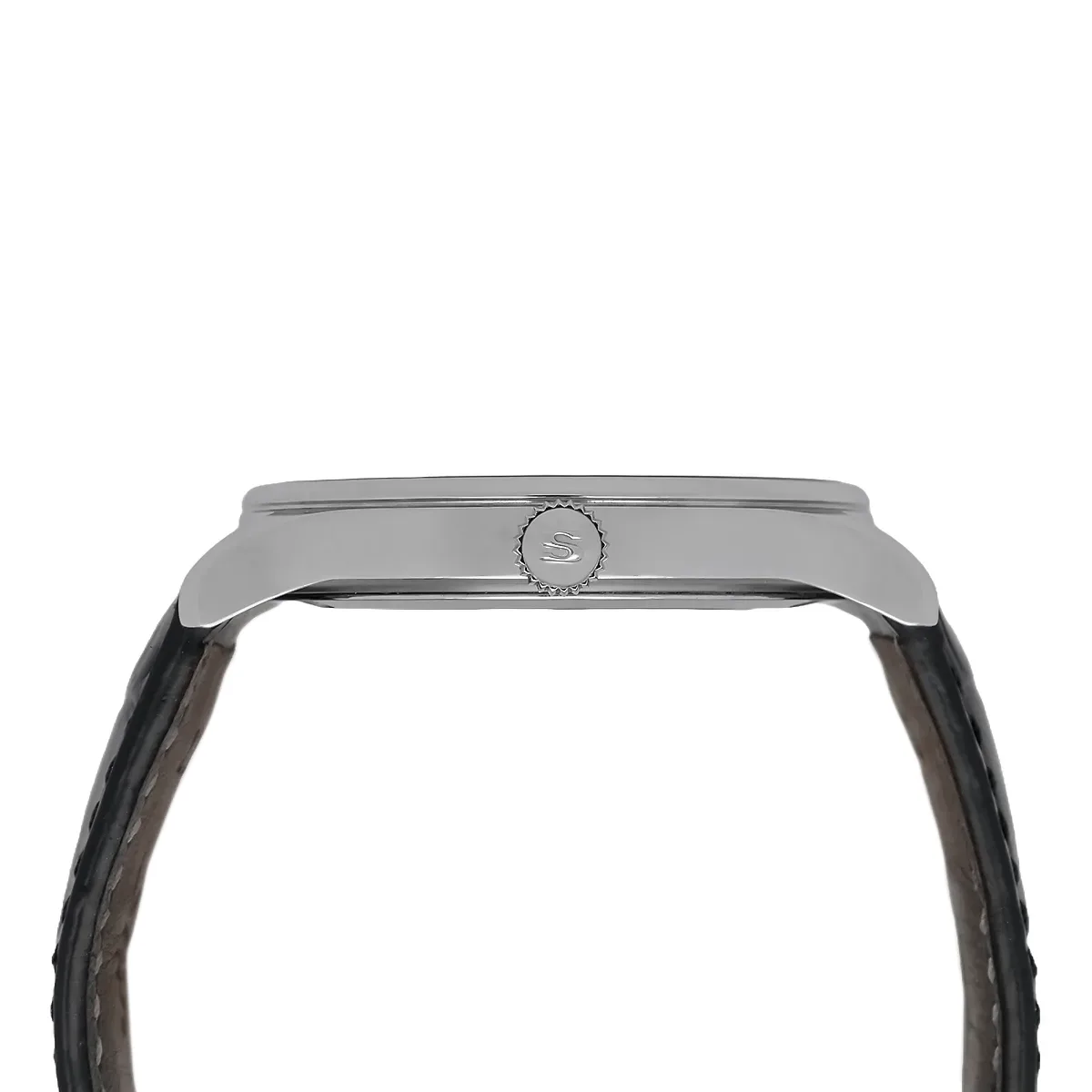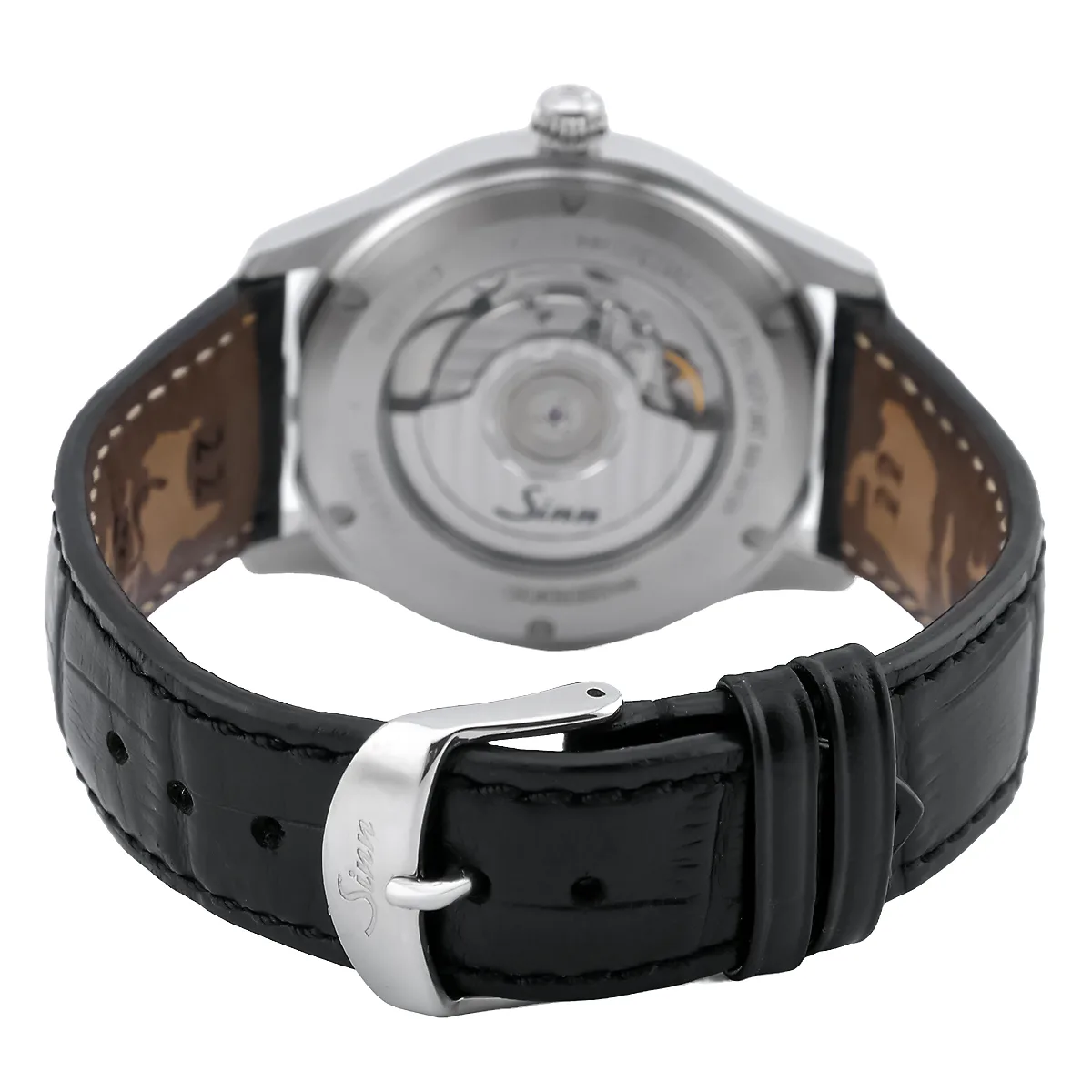 The cylindrical housing made of highly polished Stainless steel measures 42 mm in diameter with a flat overall height of 9.4 mm. The display is protected by an anti-reflective coating on both sides. Sapphire crystal, while the screw-fastened base also has a viewing window made of scratch-resistant Sapphire crystal is equipped. The housing design is vacuum-proof and offers reliable compressive strength up to 10 bar. The discreetly dimensioned winding crown blends seamlessly into the polished right-hand side of the case.