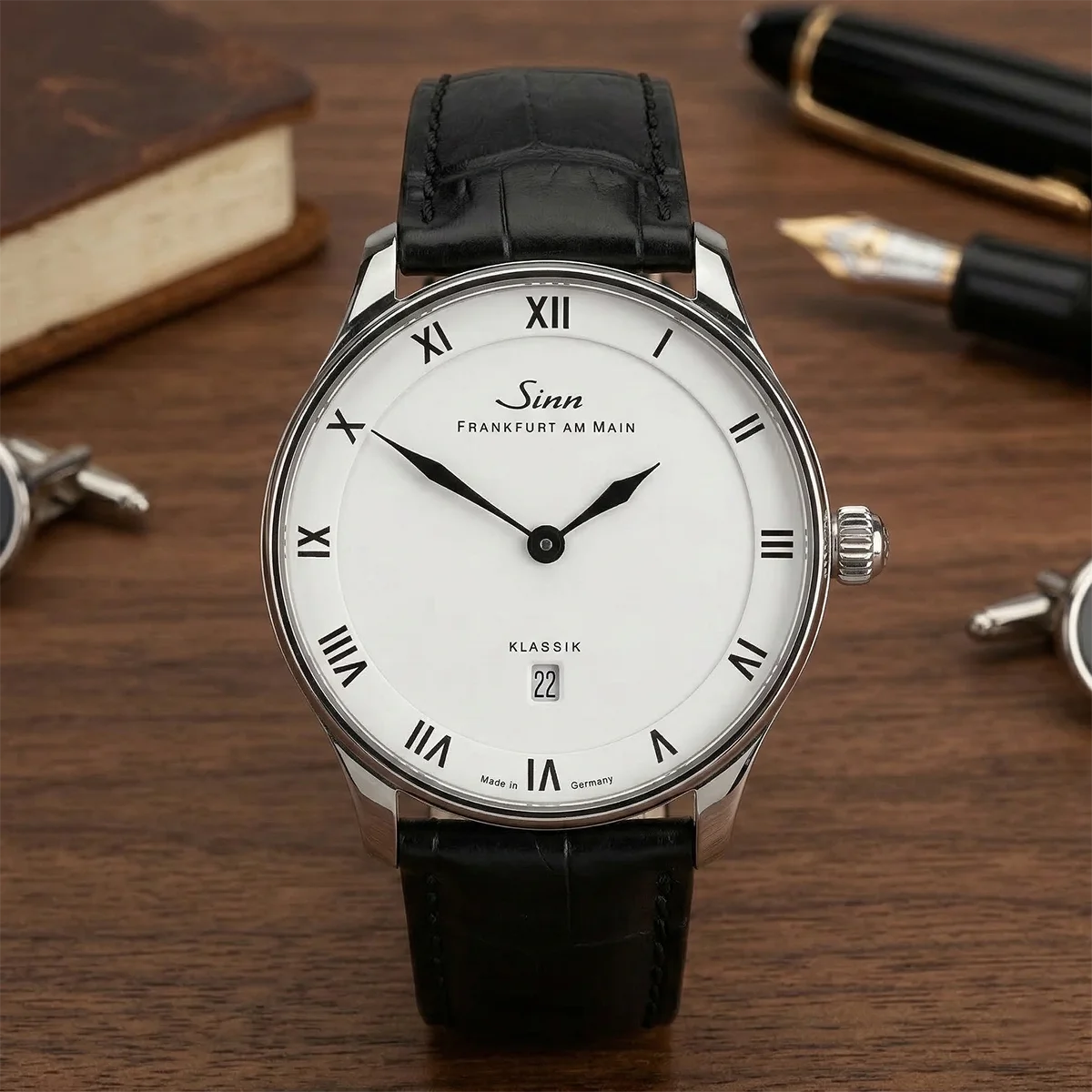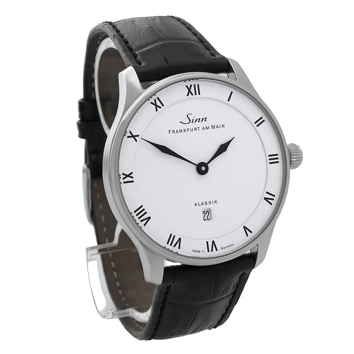 The pure white dial is lavishly finished in order to emphasize the visual depth of historical Enamel precisely. Slim leaf hands glide over fine Roman numerals and a discreetly printed minute scale on the outer edge. The high-contrast color scheme guarantees excellent legibility in a wide range of lighting conditions. A flush-integrated date window at three o'clock seamlessly adjoins the narrow Rehaut and complements the functional level without breaking through the reduced geometry of the dial.