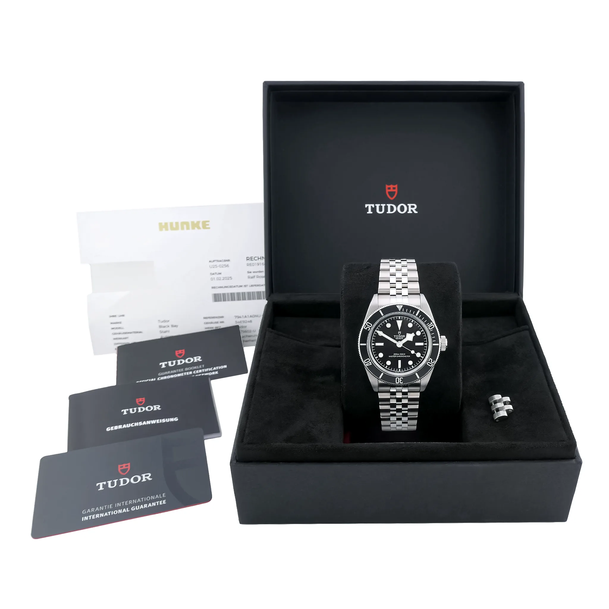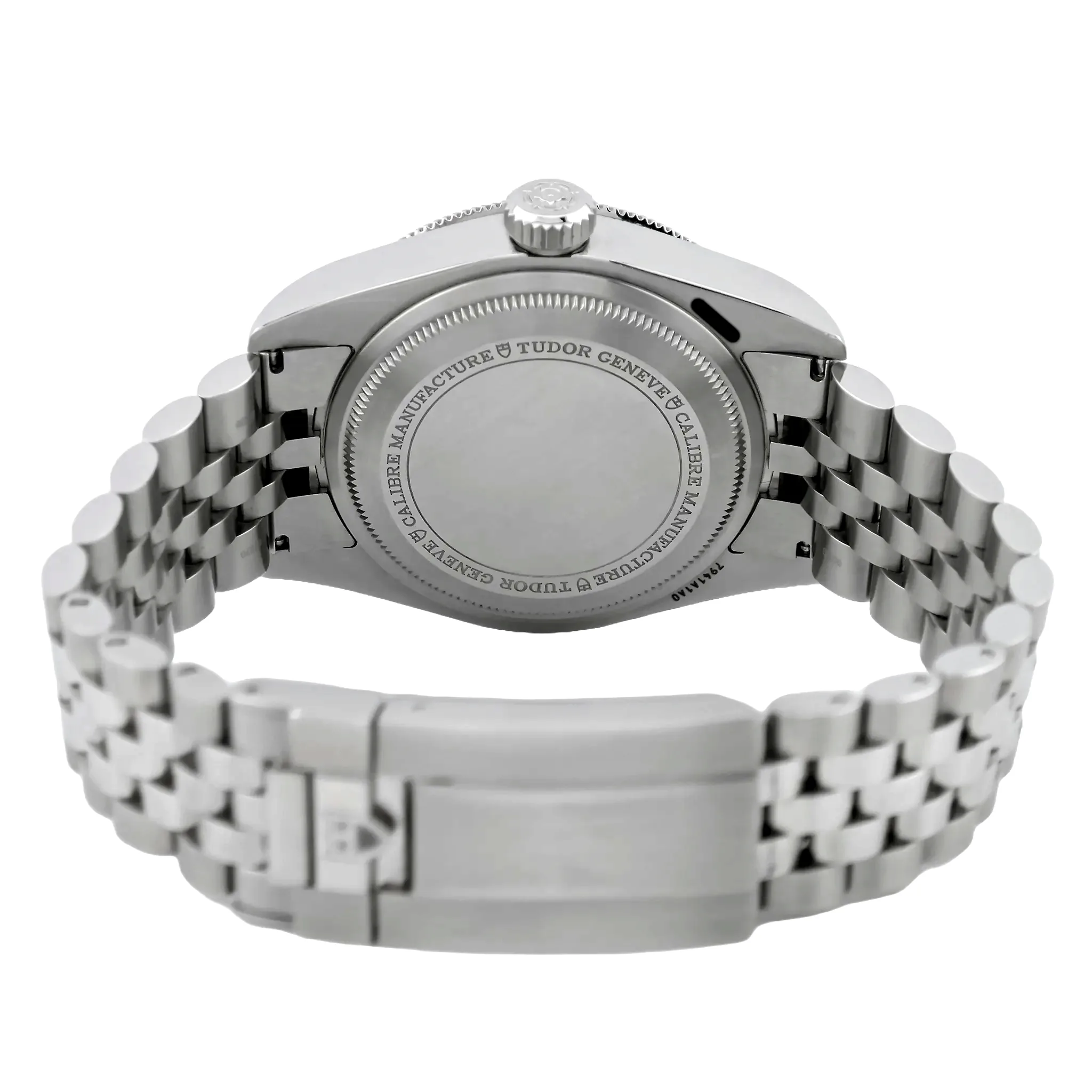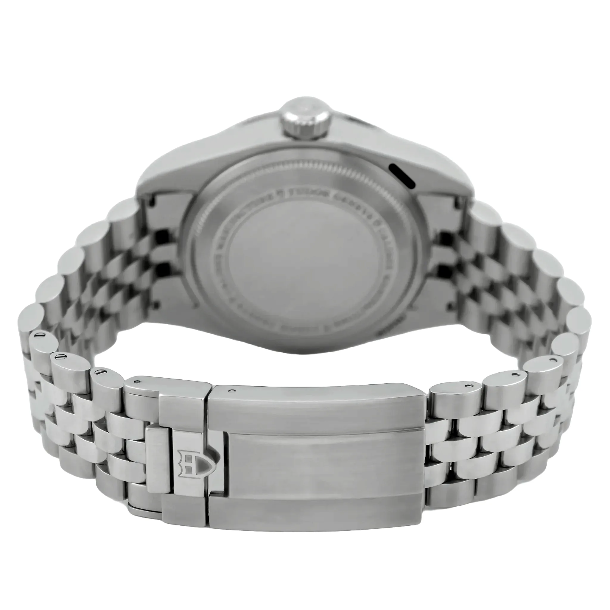 The satin-finished and polished case Stainless steel measures 41 mm im Durchmesser und zeichnet sich durch ergonomisch optimierte Proportionen an den Flanken aus. Die griffige Krone mit dem Relief der Tudor-Rose ermöglicht eine sichere Bedienung. Eine einseitig drehbare Lünette aus Stainless steel mit einem Zahlenscheiben-Inlay aus schwarzem Aluminum rahmt das gewölbte Saphirglas ein. Konstruktionsbedingt wird eine Wasserdichtigkeit von 200 meters erreicht, was professionelle Tauchgänge vollumfänglich gewährleistet.