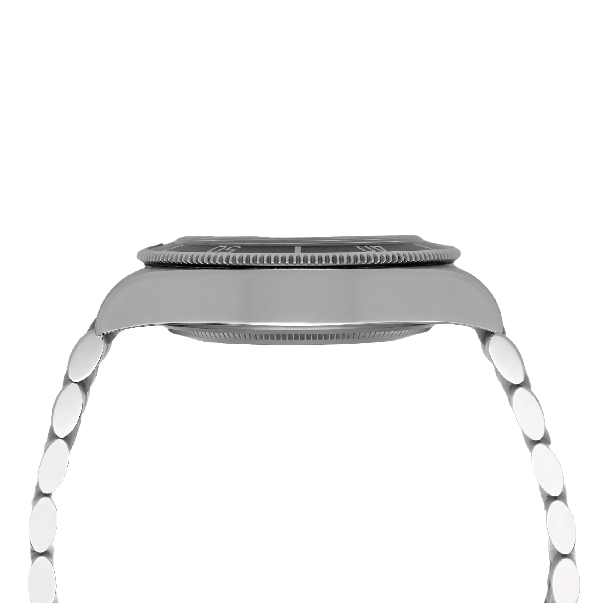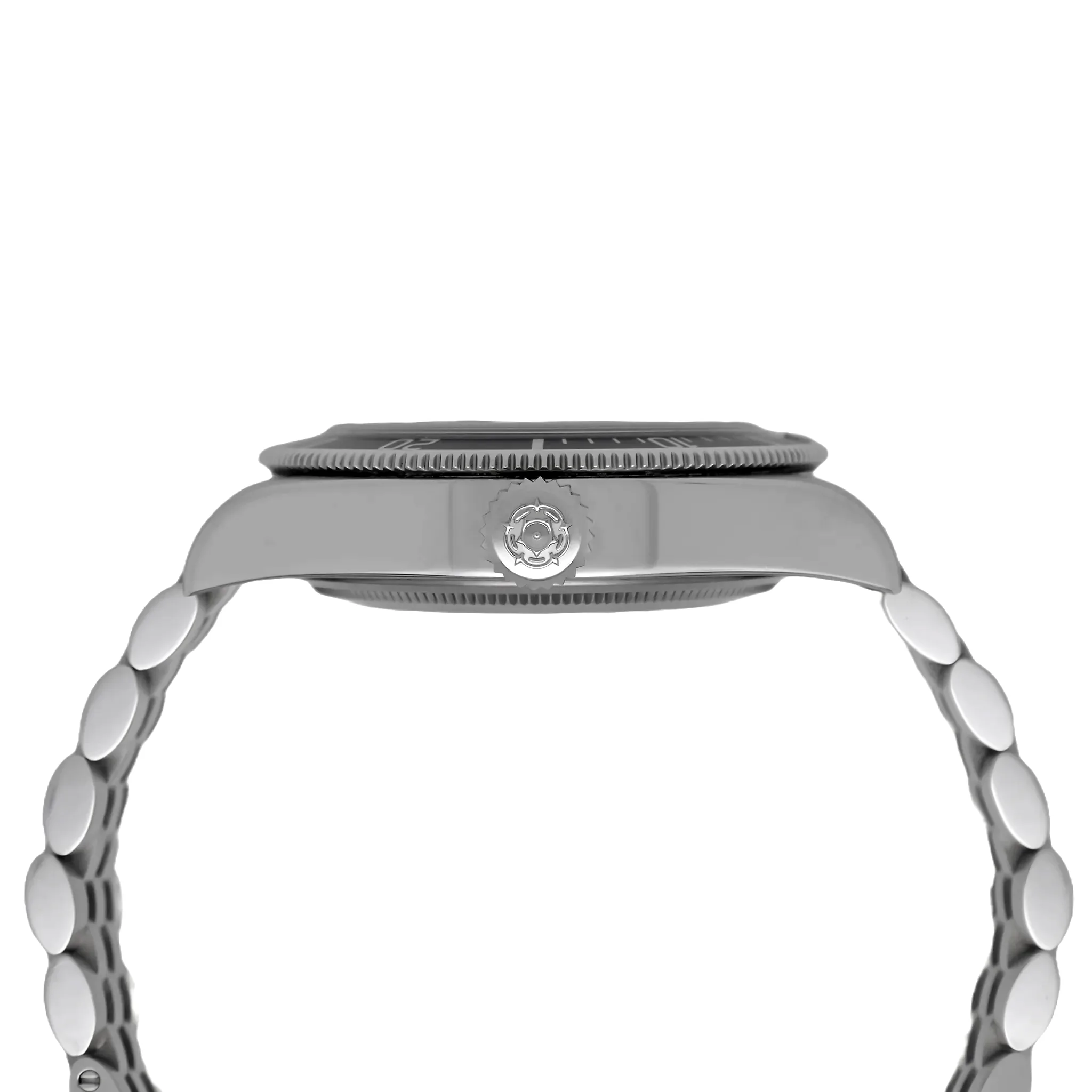 Das mattschwarze Zifferblatt wird durch applizierte Indizes mit rhodinierter Umrandung präzise strukturiert. Die applizierte Leuchtmasse sorgt für eine hervorragende Lumineszenz und Ablesbarkeit bei schlechten Lichtverhältnissen. Typisch für die Baureihe sind die kantigen Snowflake-Zeiger, die eine intuitive Unterscheidung der Stunden- und Minutenanzeige unter Wasser ermöglichen. Der Verzicht auf eine Datumsanzeige garantiert ein symmetrisches Layout. Eine subtil integrierte silberne Minuterie am Rand erzeugt, kombiniert mit dem Glas, zusätzliche optische Tiefe.