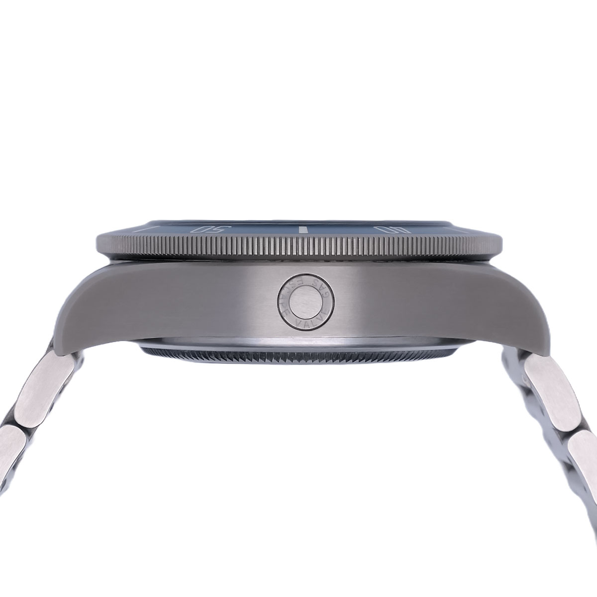 The brushed grade 2 titanium case is exceptionally light and corrosion-resistant. The striking unidirectional rotating bezel with blue ceramic inlay and luminous markings enables precise dive time monitoring even under difficult conditions.