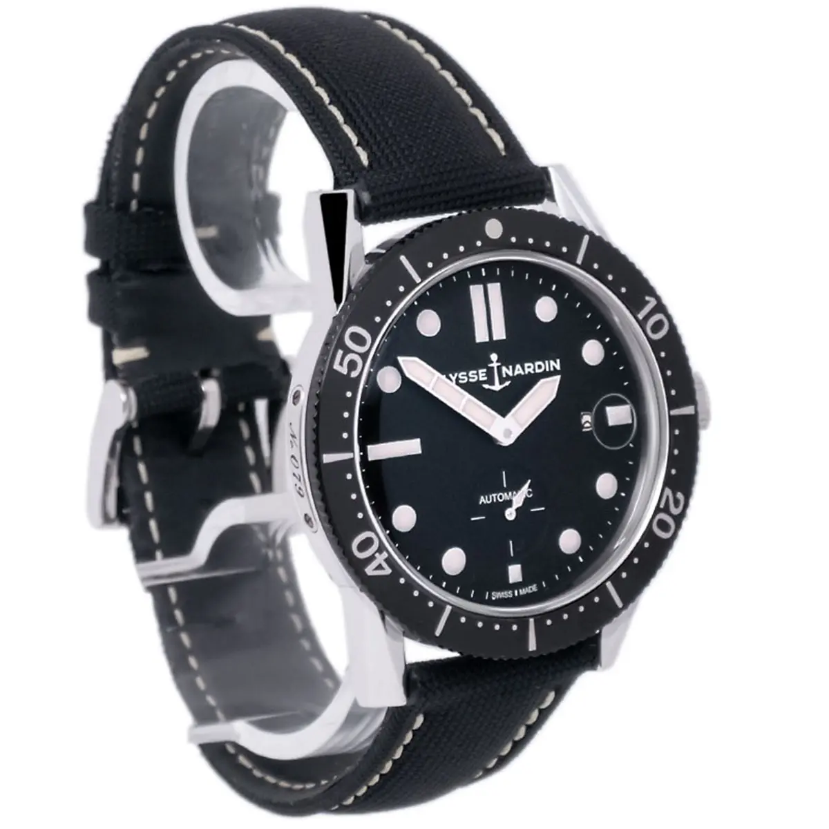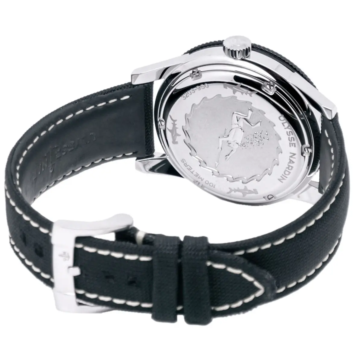 The case is made of stainless steel with a diameter of 42.2 mm and a height of 12.5 mm. The strap is made of robust canvas with a Kauschuk lining for comfort and durability.