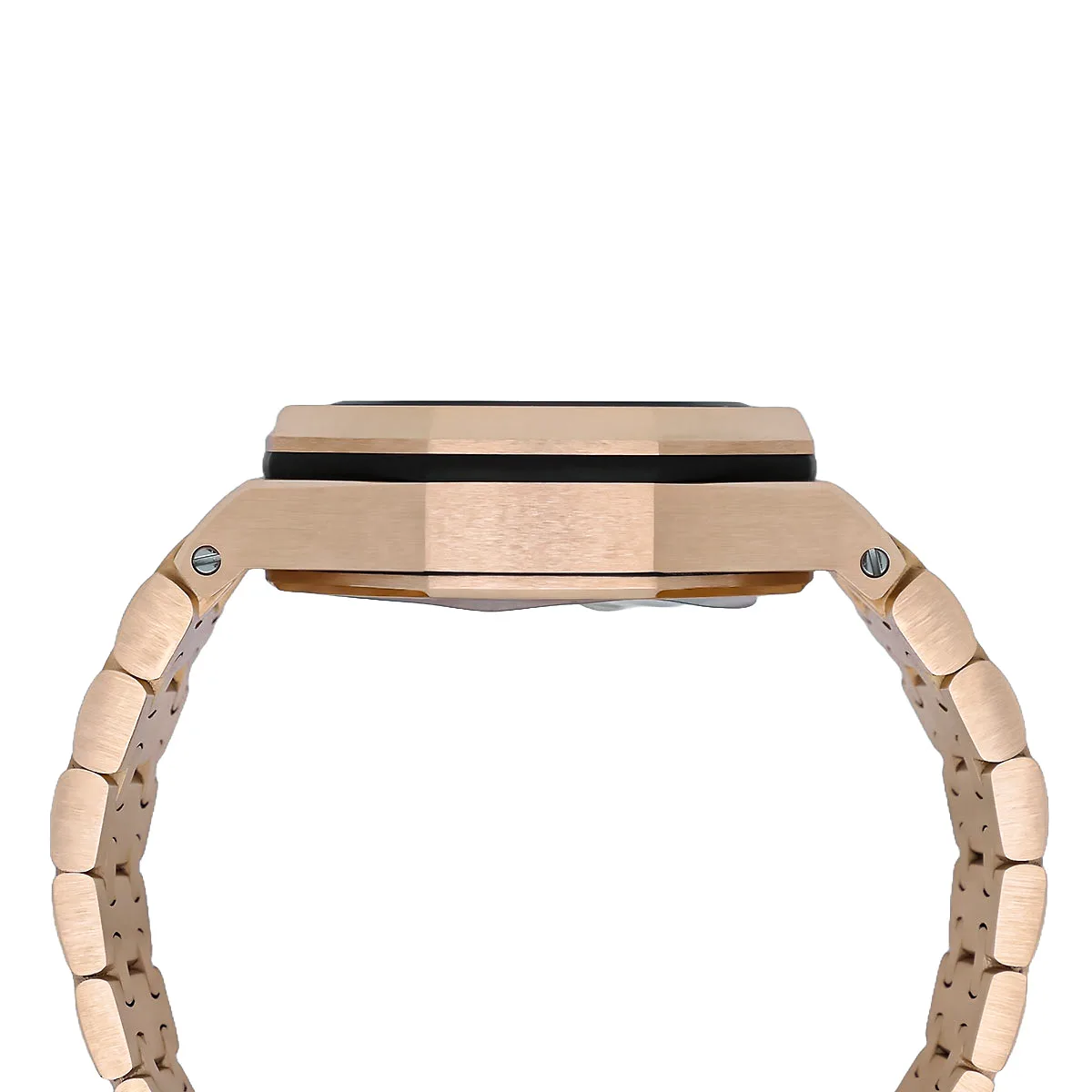 Die Lancierung der Offshore-Linie im Jahr 1993 erweiterte die Grenzen der traditionellen Sportuhr durch extremere Proportionen. Die vorliegende Referenz 26470OR.OO.1000OR.01, in Sammlerkreisen aufgrund ihres enormen Gewichts als „Brick“ bekannt, treibt diesen Ansatz auf den Gipfel. Sie kombiniert die radikale, von Gérald Genta inspirierte Linienführung mit der unbestreitbaren Präsenz von 18 Karat Roségold. Der Zeitmesser verkörpert kompromisslose Massivität und bewahrt gleichzeitig die architektonische Strenge der achteckigen Lünette, welche durch acht sichtbare Schrauben aus Weißgold fixiert wird.