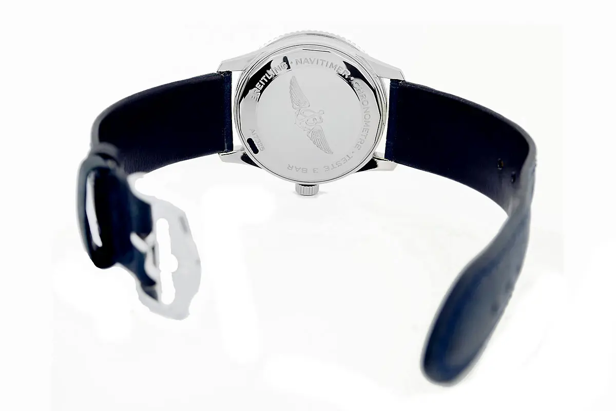 Das Gehäuse aus Edelstahl verfügt über einen moderaten Durchmesser von 38 mm, was eine hervorragende Ergonomie gewährleistet. Markant ist die kannelierte Lünette, die für die intuitive Bedienung des Rechenschiebers optimiert wurde. Die Oberflächen weisen eine feine Politur auf, während die Gehäuseflanken präzise Linien zeigen. Eine Wasserdichtigkeit von 3 bar schützt die Mechanik vor äußeren Einflüssen. Der massive Gehäuseboden ist verschraubt und schließt bündig ab, was den Tragekomfort am Armband zusätzlich unterstützt und die Robustheit der Konstruktion betont.