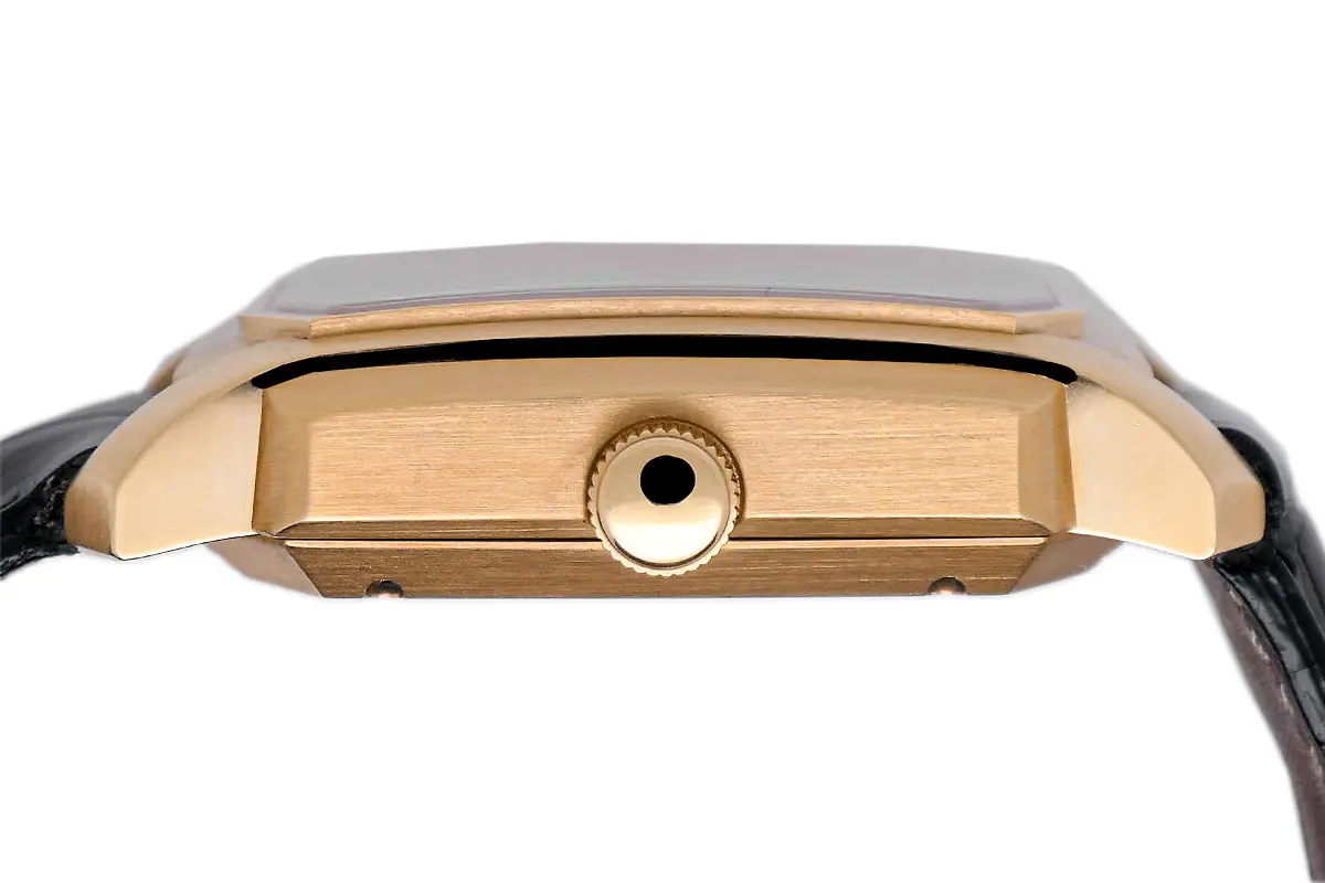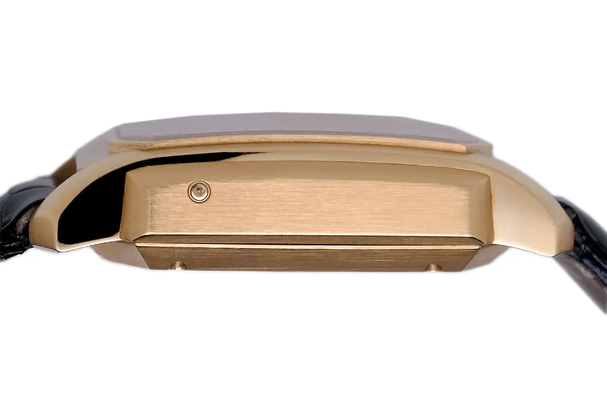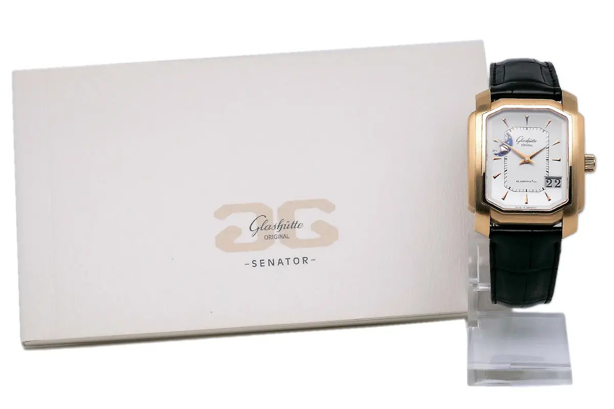 Besondere Merkmale: Die Karree-Form des Gehäuses ist ein markantes Designmerkmal von Glashütte Original. Die Kombination aus Rotgold, Panoramadatum und Mondphase verleiht der Uhr einen luxuriösen Charakter. Die Uhr hat einen Sichtboden, durch den man das Uhrwerk bewundern kann.