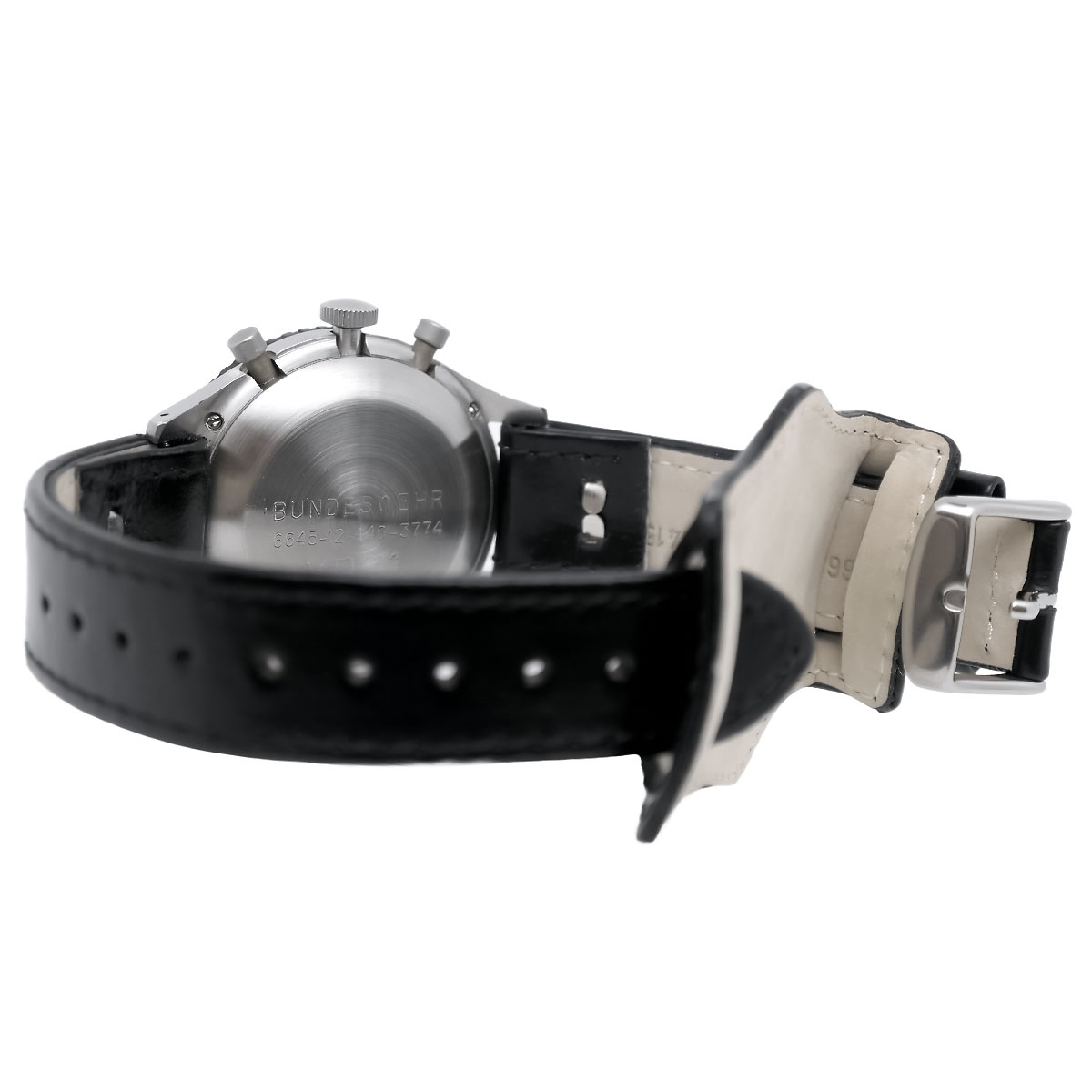 Besondere Merkmale: Die militärische Prägung mit der Versorgungsnummer der Bundeswehr auf dem Gehäuseboden ist ein charakteristisches Merkmal. Die „3H“ Markierung auf dem Zifferblatt weist auf die Verwendung von Tritium als Leuchtmasse hin. Die Einfachheit und Funktionalität des Designs machen diese Uhr zu einem begehrten Sammlerstück.