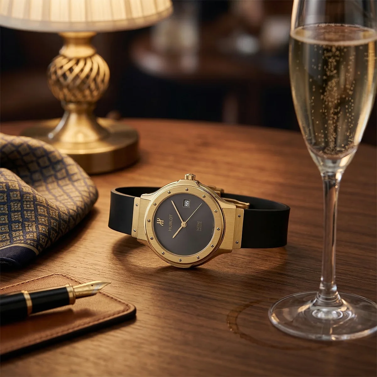 Die Referenz 1391.3 repräsentiert die ursprüngliche Vision von Carlo Crocco und markiert die Geburtsstunde des „Art of Fusion“. Dieses Modell aus dem Jahr 1999 verkörpert das klassische MDM-Design, das die Luxusuhrenwelt durch die damals revolutionäre Kombination aus edlem 18k Gelbgold und sportlichem Naturkautschuk nachhaltig veränderte. Das 28 mm Gehäuse besticht durch die ikonische Bullaugen-Form (franz. Hublot), fixiert durch die charakteristischen 12 Schrauben auf der Lünette. Das tiefschwarze, minimalistische Zifferblatt verzichtet bewusst auf Indizes, um die Reinheit der Formensprache in den Vordergrund zu stellen. Die polierten Fasen und die satinierten Flächen des Goldgehäuses erzeugen ein spannungsvolles Lichtspiel.