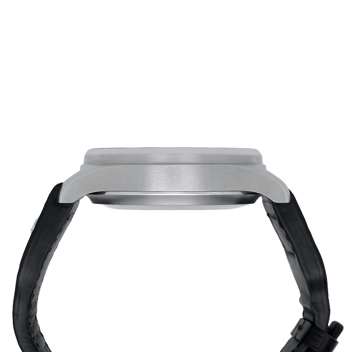 Die IWC Große Fliegeruhr Big Pilot Watch mit der Ref. IW500201 ist ein Herrenmodell mit einem Automatischen Manufakturkaliber 5011 mit beeindruckenden 7 Tagen Gangreserve (168 Stunden) und hocheffizientem Pellaton-Aufzugssystem. Sie hat ein markantes 46,2 mm Edelstahlgehäuse mit charakteristischer Größe, welches direkt an historische Fliegeruhren erinnert. Verschraubter Gehäuseboden, Weicheisen-Innengehäuse zur magnetischen Abschirmung, wasserdicht bis 6 bar (60 Meter). Klassisches schwarzes Zifferblatt mit arabischen Ziffern in bestens lesbarer Fliegeruhr-Typografie. Leuchtende Zeiger und Indizes für optimale Ablesbarkeit auch bei Dunkelheit. Charakteristisches Dreieck bei 12 Uhr. Gewölbtes Saphirglas mit beidseitiger Entspiegelung für perfekte Ablesbarkeit. Die legendäre konische Krone – ein Markenzeichen der Big Pilot – ermöglicht komfortables Aufziehen auch mit Fliegerhandschuhen. Schwarzes Lederband mit markanter Naht und Edelstahl-Faltschließe.