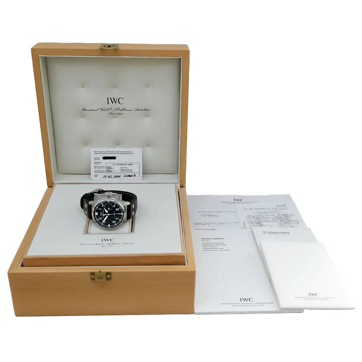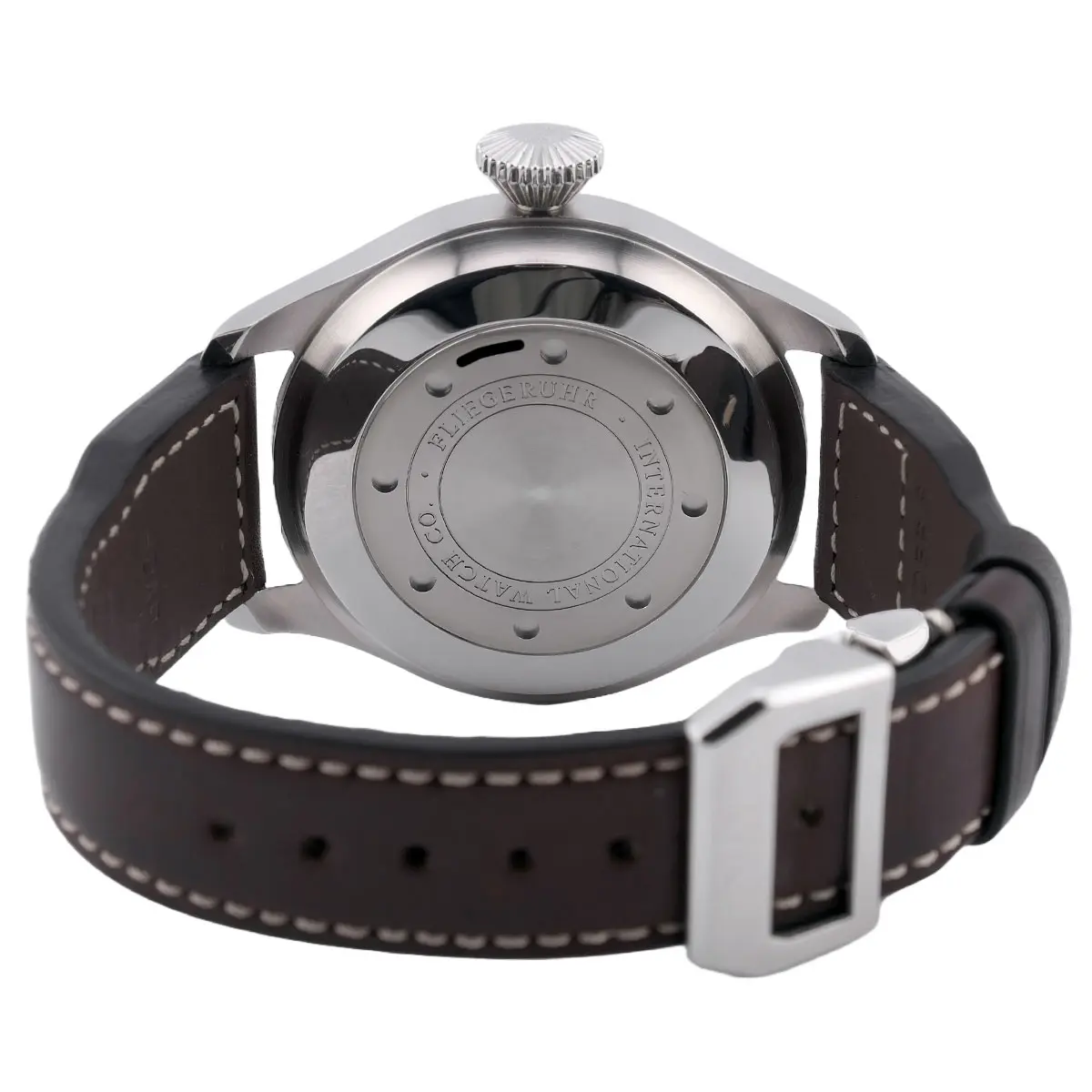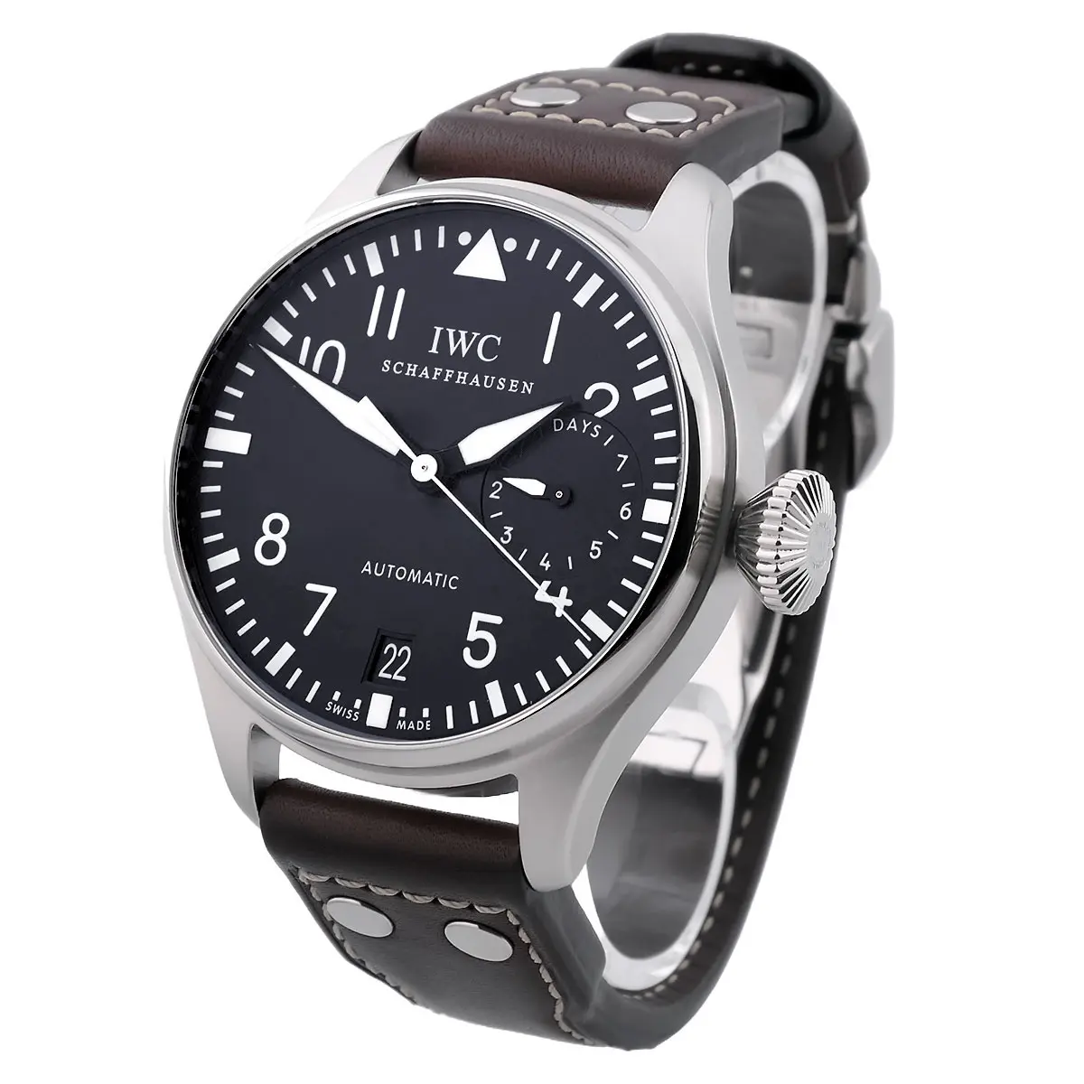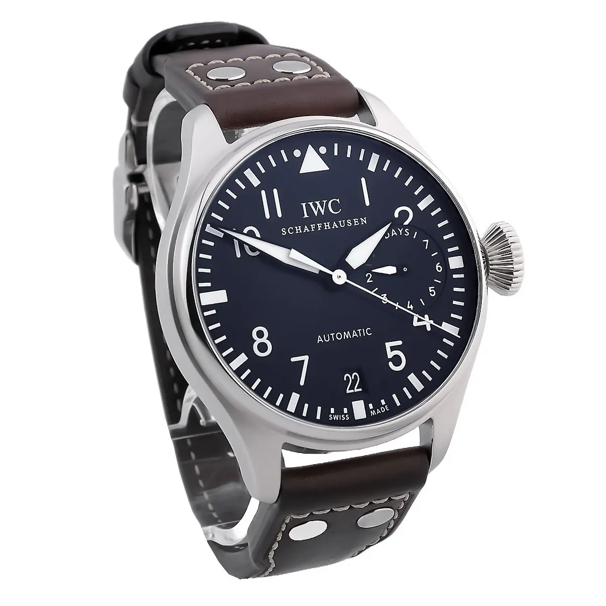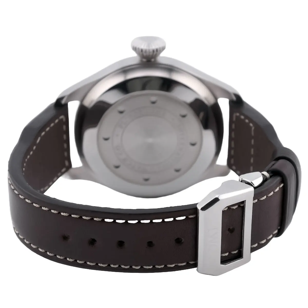 Die Big Pilot hat eine markante Präsenz am Handgelenk, die durch ihre ausgeprägte Form und das edel verarbeitete Gehäuse zusätzlich betont wird. Die polierte Oberfläche sorgt für eine zeitlose Ästhetik, die sowohl in formellen als auch in informellen Anlässen glänzt. Das massive Edelstahlgehäuse mit einem Durchmesser von 46 mm und einer Höhe von 15,5 mm ist robust und dennoch elegant. Das klassische Zifferblatt der Big Pilot IW500401 ist im typischen IWC-Stil gehalten, mit einem klar strukturierten Design, das sowohl die Lesbarkeit als auch die Funktionalität in den Vordergrund stellt. Die großen, leuchtenden Ziffern und Zeiger sorgen für hervorragende Ablesbarkeit, auch bei schlechten Lichtverhältnissen. Das Zifferblatt ist schwarz gehalten, was einen markanten Kontrast zu den weißen Ziffern und Zeigern bietet. Ein Highlight ist der prominente Datums- und Gangreserveanzeiger auf der linken Seite des Zifferblatts, der eine Gangreserve von bis zu 7 Tagen anzeigt. Im Inneren arbeitet das IWC Kaliber 51111, ein hochwertiges Automatikwerk, das für seine Präzision und Zuverlässigkeit bekannt ist. Mit einer Gangreserve von 7 Tagen stellt es sicher, dass Sie auch bei längeren Pausen zwischen dem Tragen der Uhr nicht auf die Zeit angewiesen sind, um sie erneut aufzuziehen. Das Uhrwerk ist mit einer Feinregulierung ausgestattet, die eine äußerst präzise Zeitmessung ermöglicht. Die Uhr wird mit einem handgefertigten Büffellederband geliefert, das sowohl Komfort als auch Strapazierfähigkeit bietet. Das braune Lederband ergänzt das klassische Design der Uhr perfekt und sorgt für einen angenehmen Tragekomfort über den gesamten Tag hinweg. Eine stabile Edelstahl-Faltschließe rundet das Gesamtbild der Uhr ab. Mit einer Wasserdichtigkeit von 60 Metern (6 bar) ist die IWC Big Pilot für den Alltag bestens gerüstet. Obwohl sie keine Sportuhr für extreme Tauchtiefen ist, schützt sie zuverlässig vor Spritzwasser und Feuchtigkeit.