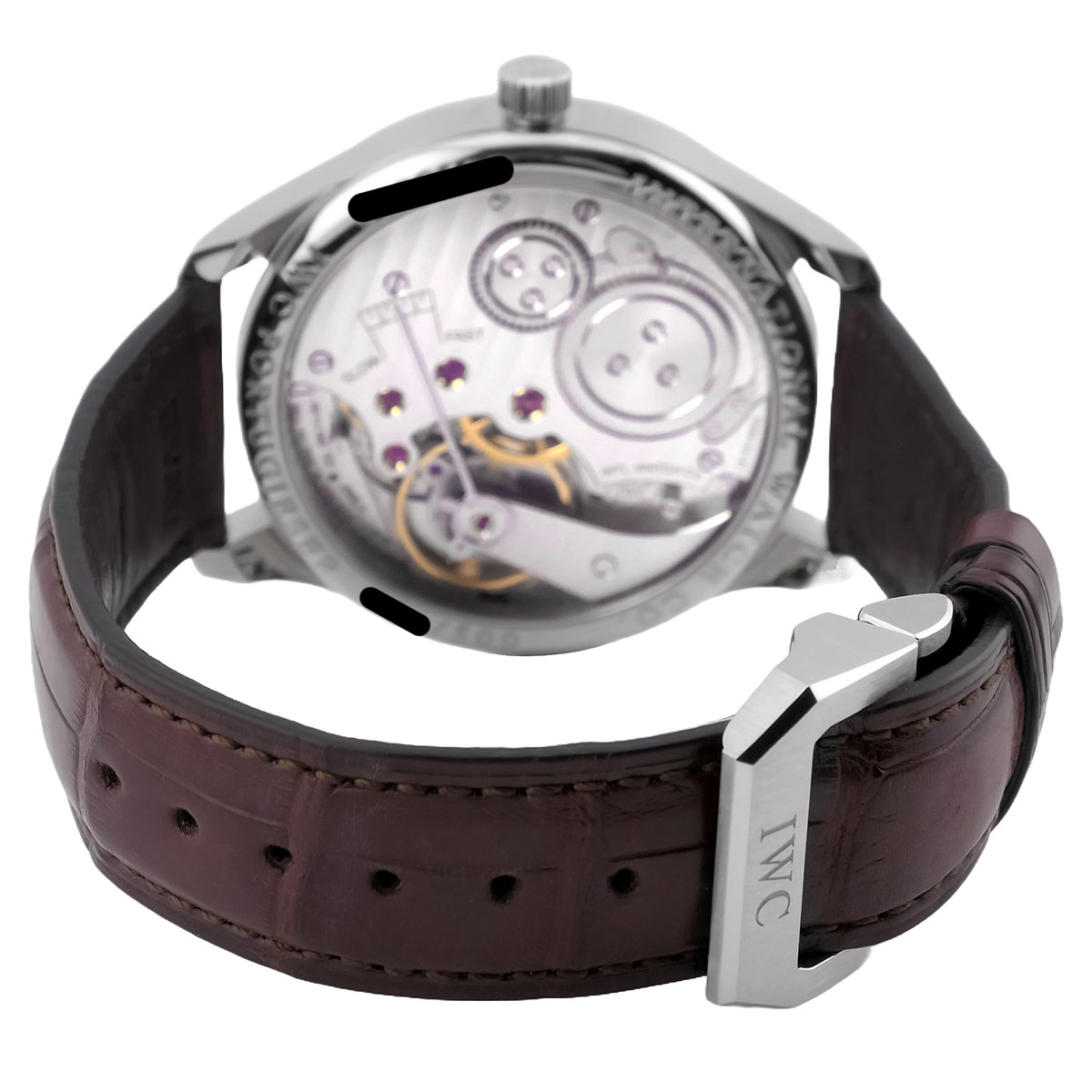 Die Referenz IW544903 gehört zu den akustisch komplexesten Kreationen aus Schaffhausen und wurde auf 500 Exemplare in 18 Karat Weißgold limitiert. Die Minutenrepetition reproduziert Stunden, Viertelstunden und Minuten durch zwei unterschiedlich gestimmte Hämmer auf Tonfedern – eine Grande Complication, die über 200 bewegliche Komponenten im Kaliber 98950 integriert. Der Full-Set-Status mit Box und Papieren sowie der sehr gute Erhaltungszustand machen diese Ausgabe zu einem begehrten Sammlerstück für Kenner akustischer Komplikationen.