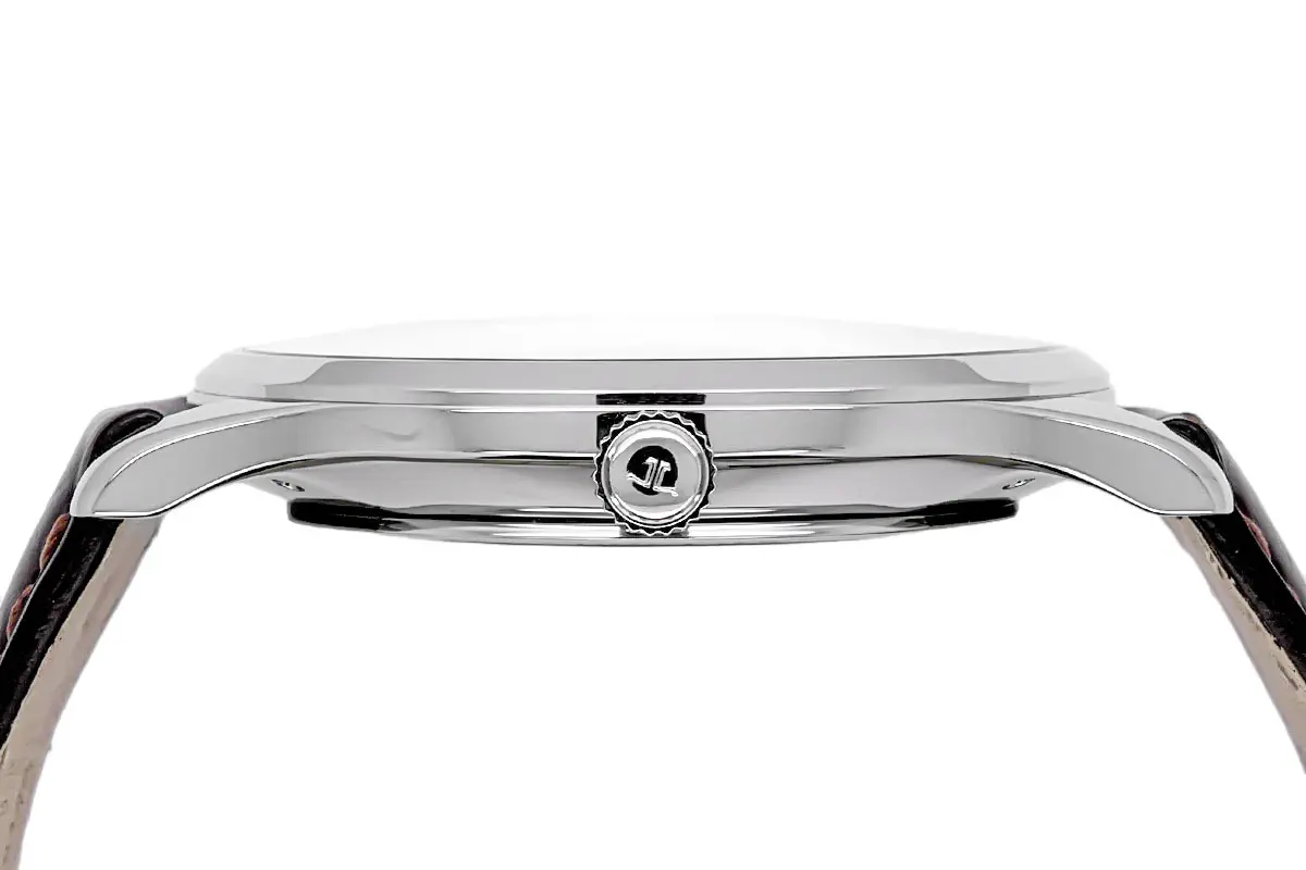 Die Fertigung des 40 mm messenden Gehäuses aus massivem Edelstahl erfordert höchste spanabhebende Präzision, um die extrem flache Bauhöhe von lediglich 8,6 mm zu realisieren. Spiegelpolierte Flanken betonen die architektonische Klarheit der Konstruktion. Unter dem schützenden, kratzfesten Saphirglas bleibt die empfindliche Mechanik sicher, während das Gehäuse einem Wasserdruck von bis zu 5 ATM widersteht. Dies unterstreicht die Zuverlässigkeit dieses hochfeinen Messinstruments.