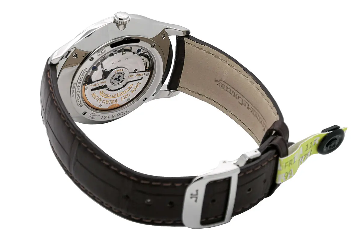 Den Takt gibt das automatische Manufakturwerk Kaliber JLC 896 vor. Mit einer Frequenz von 28.800 A/h liefert das Konstrukt eine Gangreserve von 43 Stunden. Durch den Sichtboden offenbart sich die exzellente Finissage: Makellose Côtes de Genève auf dem massiven Rotor, eine präzise Perlage auf der Platine sowie aufwendig polierte Fasen an den Brücken. Diese Werksveredelung und eine stringente Regulierung sichern einen hochpräzisen Chronometergang mit hervorragender Amplitude.