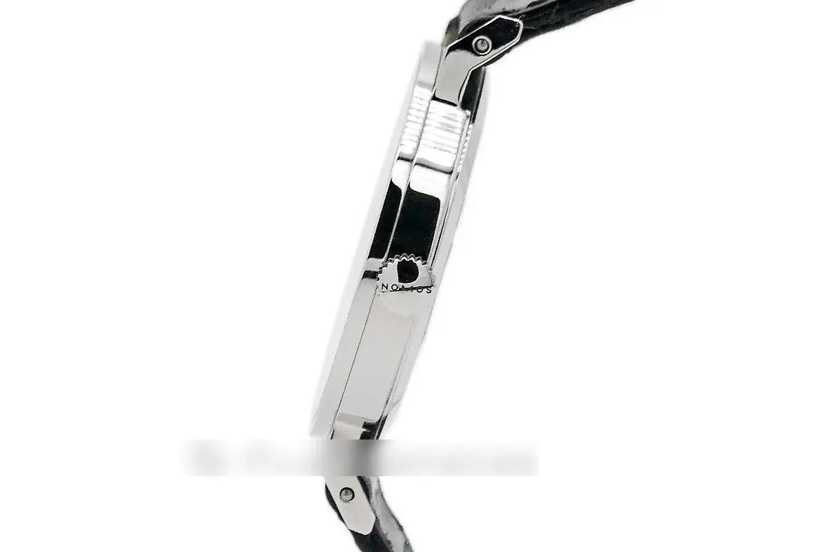 Das 35 mm Edelstahlgehäuse weist eine klare, geometrische Formgebung auf, die sich perfekt in das Bauhaus-Design einfügt. Die polierte Oberfläche und die präzise bearbeiteten Fasen lassen das Gehäuse in edlem Glanz erstrahlen. Die schlichte Eleganz der Uhr wird durch den markanten, roten Zeiger der kleinen Sekunde akzentuiert.