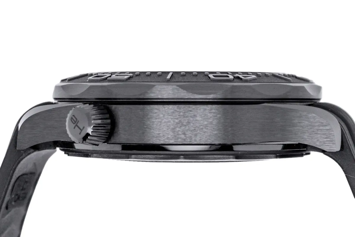 Das Keramikgehäuse in Schwarz mit einem Durchmesser von 43,5 mm und einer Gehäusehöhe von 14,47 mm sorgt für eine sportlich-elegante Optik und ein perfektes Tragegefühl. Das gewölbte, kratzresistente Saphirglas schützt das Zifferblatt und bietet exzellente Ablesbarkeit. Das Gehäuse ist perfekt verarbeitet, und die Fasen und Anglage des Gehäuses verstärken den hochwertigen Gesamteindruck. Das Kautschukband bietet eine ideale Passform und hohen Tragekomfort.