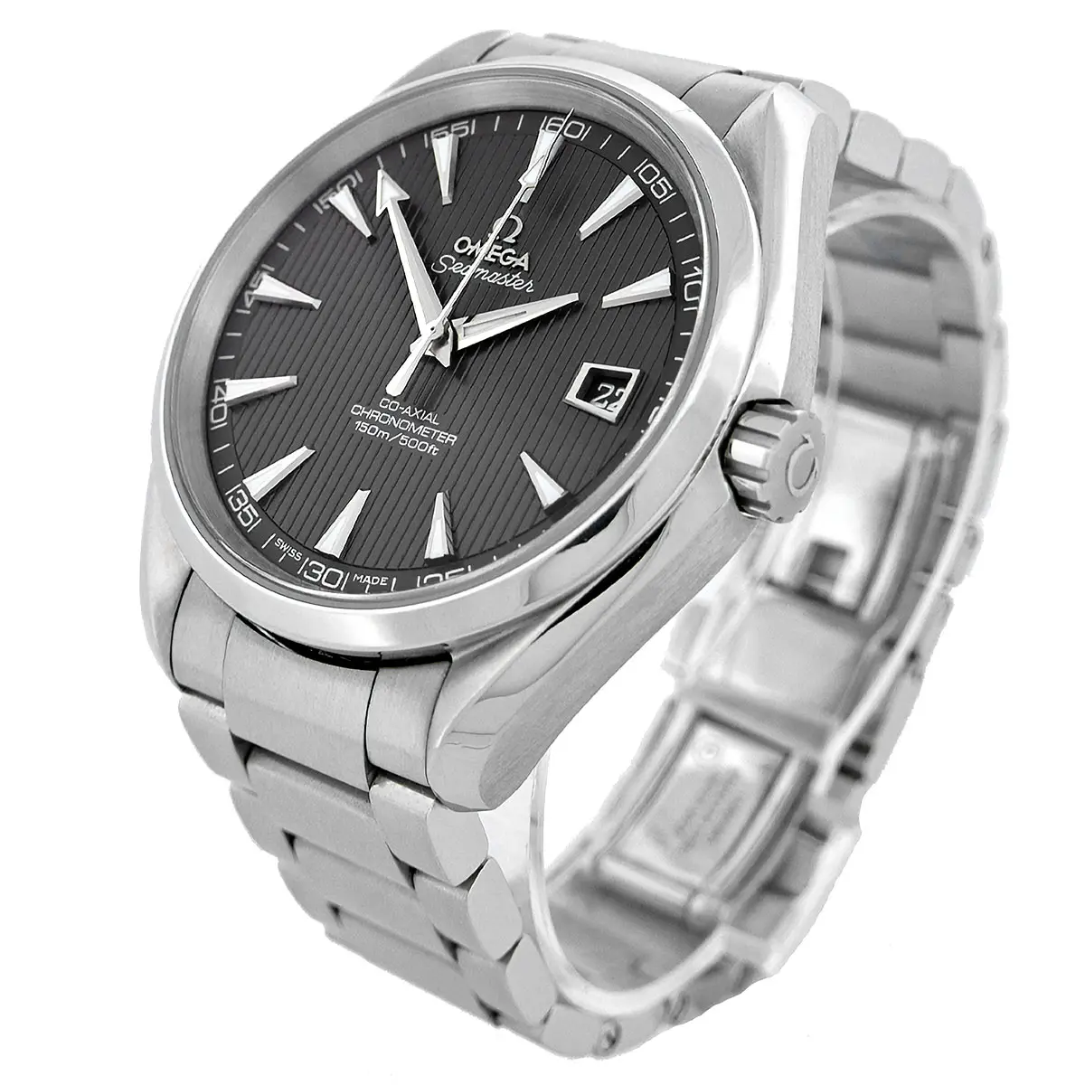 Die OMEGA Seamaster Aqua Terra 150 Kaliber 8500 mit der Referenz 231.10.42.21.06.001 ist eine vielseitige und elegante Armbanduhr, die sowohl für den täglichen Gebrauch als auch für sportliche Aktivitäten geeignet ist. Das Gehäuse besteht aus Edelstahl und hat einen Durchmesser von 41,5 mm. Die Uhr verfügt über eine verschraubte Krone und einen verschraubten Gehäuseboden, was zur Wasserdichtigkeit beiträgt. Die Lünette ist glatt und poliert, was der Uhr ein schlichtes und elegantes Aussehen verleiht. Das Zifferblatt ist in einem grauen Farbton gehalten. Die Indizes und Zeiger sind mit Leuchtmasse versehen, was eine gute Ablesbarkeit bei allen Lichtverhältnissen gewährleistet. Die Zifferblätter haben eine sehr angenehme Haptik, und ein sehr gutes ableseverhalten. Das Zifferblatt hat eine Holzoptik, diese ist unter dem Fachbegriff „Teak Concept“ bekannt. Ein kratzfestes Saphirglas schützt das Zifferblatt. Die Uhr ist mit einem Edelstahlarmband ausgestattet, das einen sicheren und komfortablen Halt bietet. Die Uhr wird vom OMEGA Co-Axial Kaliber 8500 angetrieben, einem automatischen Chronometerwerk, das für seine Präzision und Zuverlässigkeit bekannt ist. Das Uhrwerk ist durch den Glasboden sichtbar.
