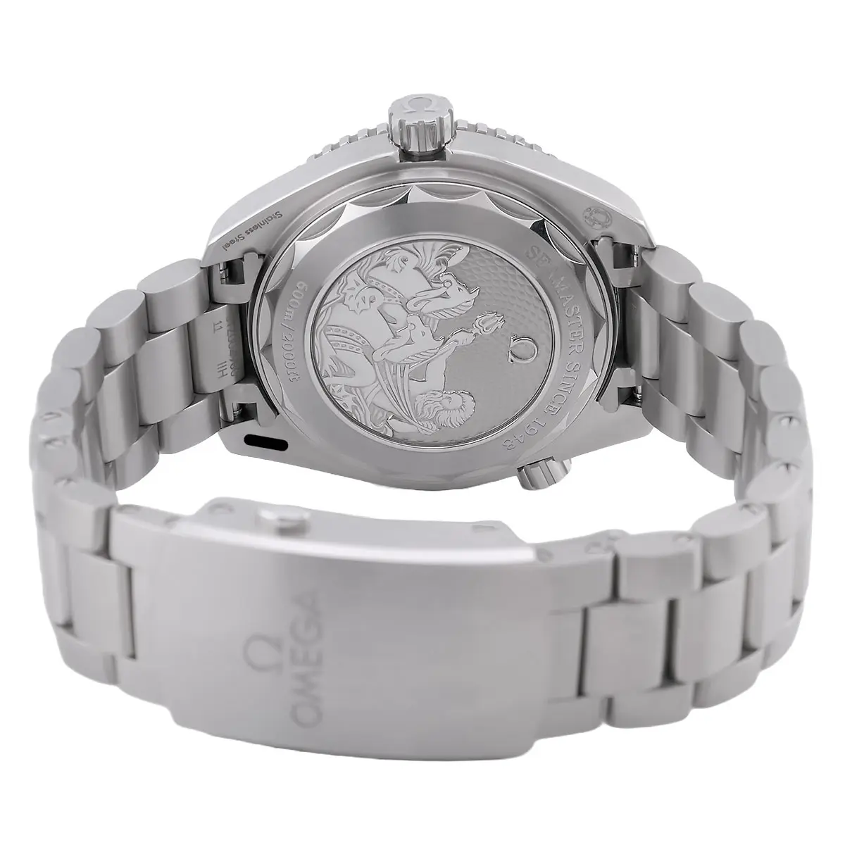 Das 39,5 mm messende Edelstahlgehäuse kombiniert satinierte und polierte Flächen, wobei die charakteristischen Lyra-Hörner und das Heliumauslassventil bei 10 Uhr die professionelle DNA der Planet Ocean unterstreichen. Auf dem massiven Gehäuseboden prangt das geprägte Logo des Poseidon mit zwei Dreizacken sowie dem historischen Seamaster-Schriftzug – ein Detail, das Sammler besonders schätzen. Im Inneren arbeitet das Kaliber 8800, ein METAS-zertifizierter Master Chronometer. Dieses Uhrwerk garantiert höchste Präzision, eine Gangreserve von 55 Stunden und eine Resistenz gegen Magnetfelder bis 15.000 Gauß. Rhodinierte Zeiger und Indizes, gefüllt mit hellblauer Super-LumiNova, sichern die Ablesbarkeit auch unter widrigsten Bedingungen.