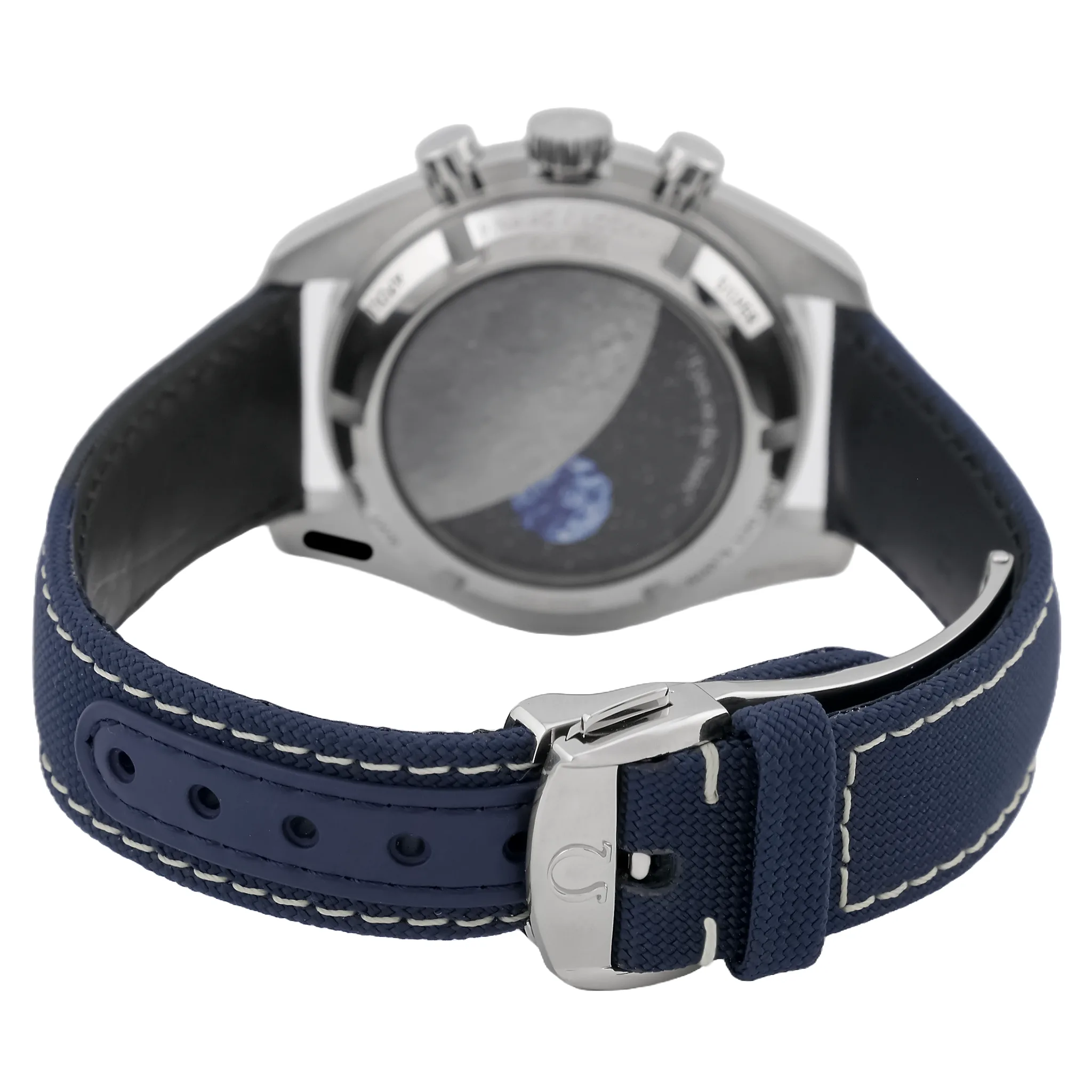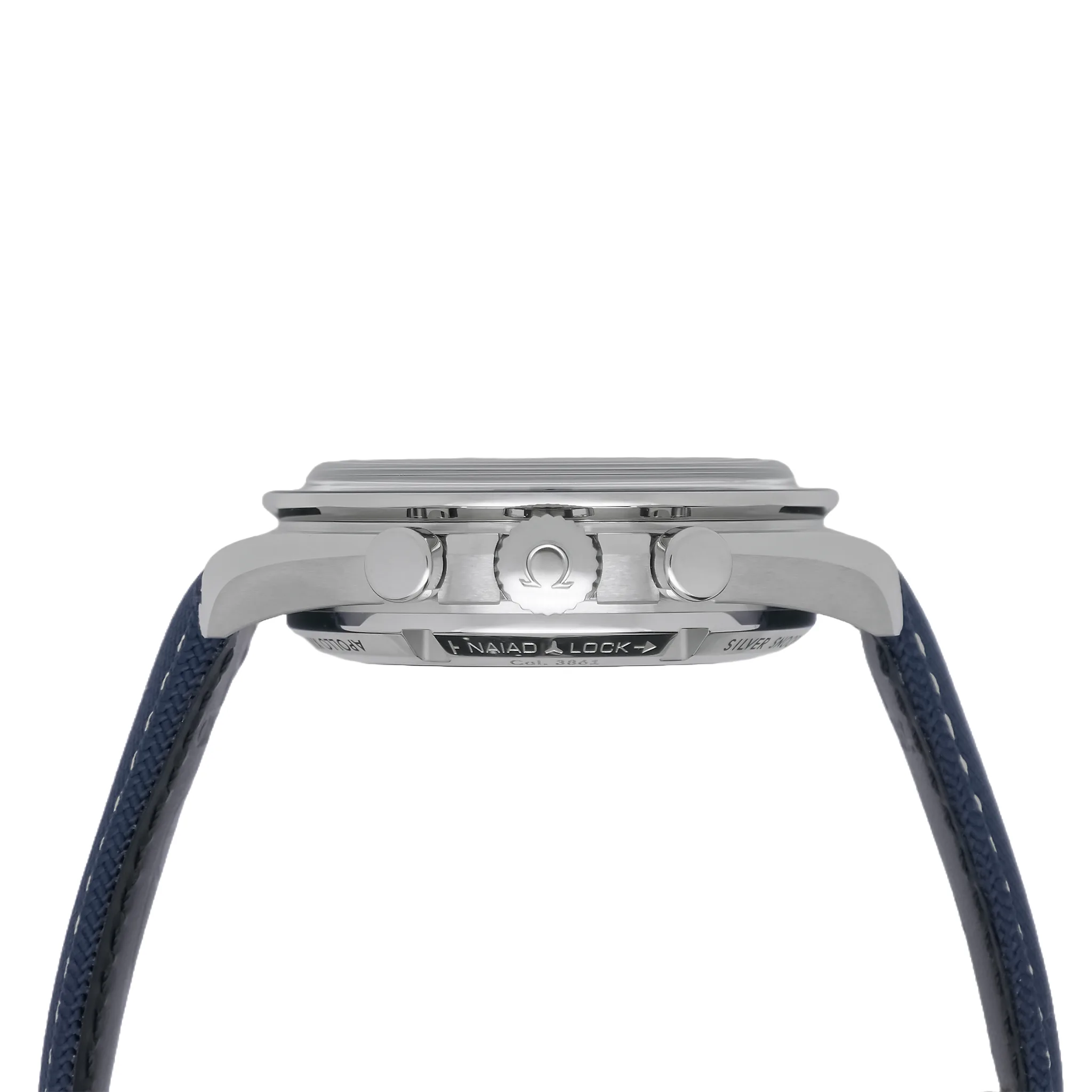 Das asymmetrische Gehäuse misst 42 mm im Durchmesser und besteht vollständig aus gebürstetem und poliertem Edelstahl. Die Lünette aus kratzfester Keramik ist mit einer Tachymeterskala aus weißem Email versehen, welche das historische „Dot over Ninety“-Detail aufweist. Geschützt wird das Ensemble durch gewölbtes Saphirglas. Die Wasserdichtigkeit beträgt 5 ATM. Ein Armband aus blauem Nylongewebe sichert das Modell am Handgelenk.