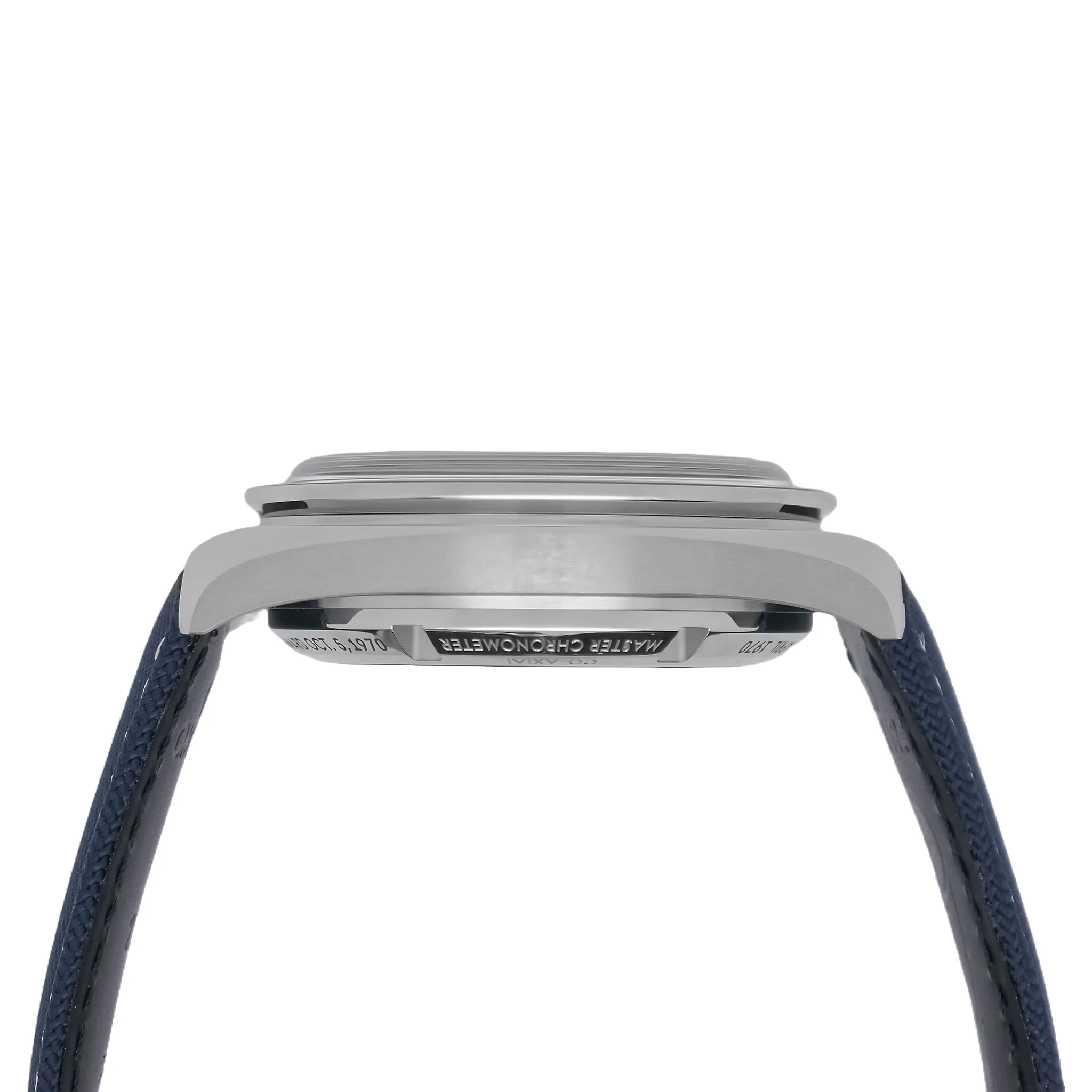 Das aus massivem Silber (Ag925) gefertigte Zifferblatt bildet einen hellen, kontrastierenden Hintergrund für die gebläuten Hilfszifferblätter. Auf der Neun-Uhr-Position ruht ein tief geprägtes Snoopy-Medaillon. Blaue Zeiger und Indizes, ausgestattet mit lang anhaltender Leuchtmasse, gewährleisten jederzeit eine optimale Ablesbarkeit. Ein farblich abgestimmter Rehaut fasst die funktionalen Anzeigen präzise ein. Die Kombination der blauen Akzente und des silbernen Grundtons unterstreicht den instrumentellen Charakter.