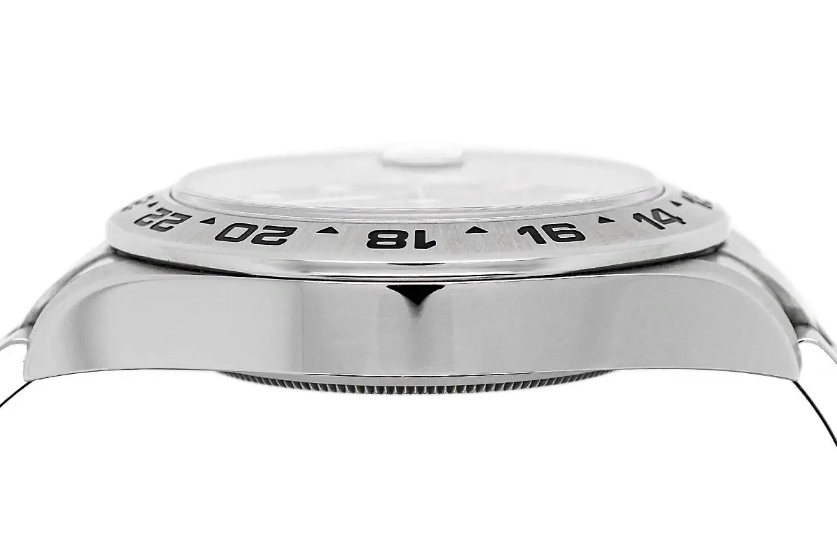 Das Gehäuse ist aus einem massiven Block Edelstahl 904L (Oystersteel) gefertigt. Die feststehende Lünette mit 24-Stunden-Graduierung weist einen radialen Sonnenschliff auf, der als Erkennungsmerkmal der Explorer-Linie gilt. Mit 42 mm Durchmesser und breiten Hörnern wirkt die Uhr sehr robust. Die Twinlock-Aufzugskrone sichert eine Wasserdichtigkeit bis 100 Meter (10 bar). Eine Besonderheit der Variante mit schwarzem Zifferblatt ist der sogenannte „Phantom-Effekt“: Die Basis der Zeiger ist schwarz lackiert, wodurch diese über dem Zifferblatt zu schweben scheinen.