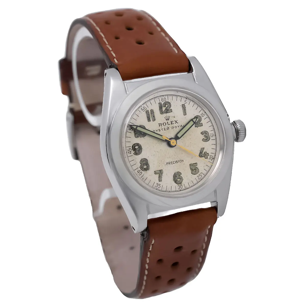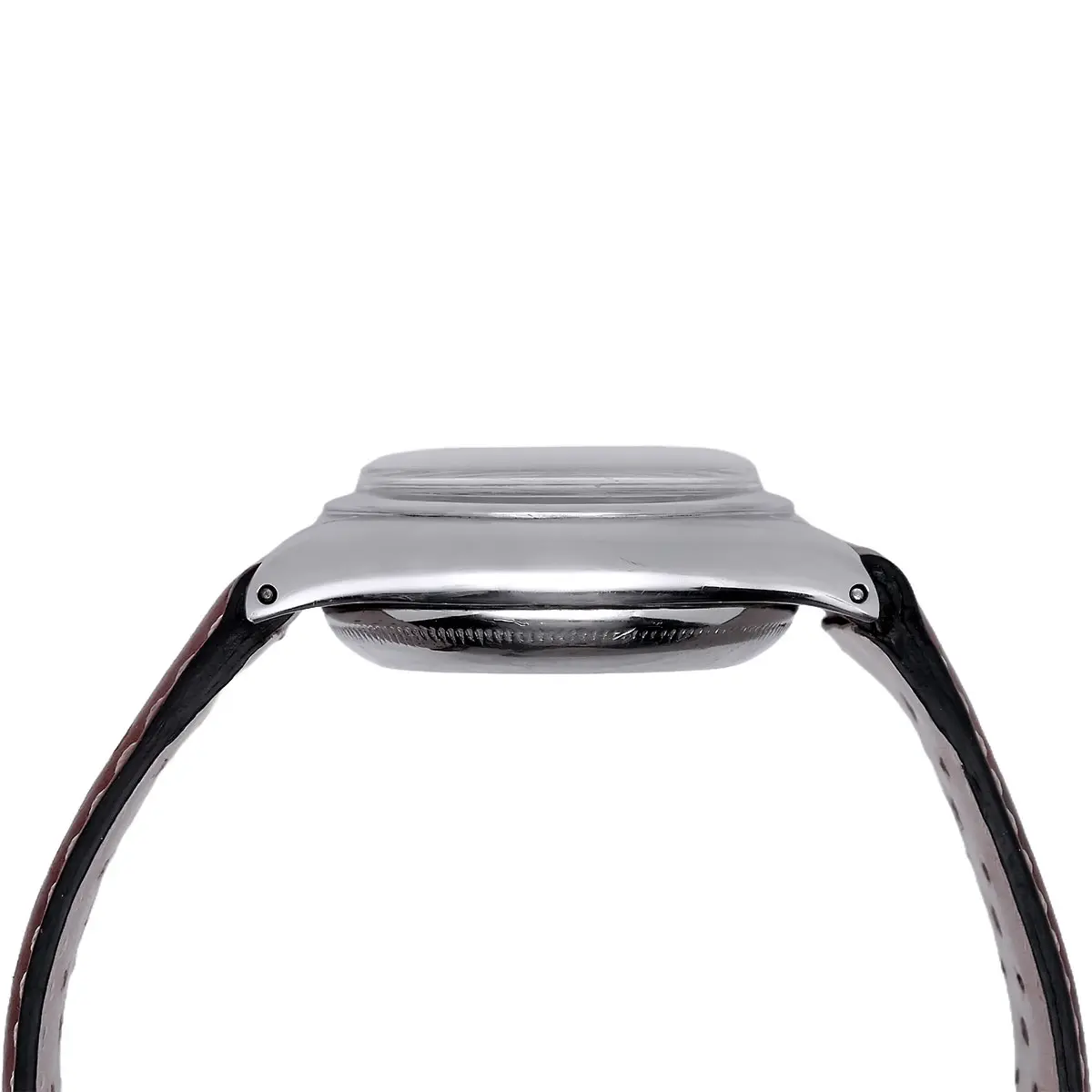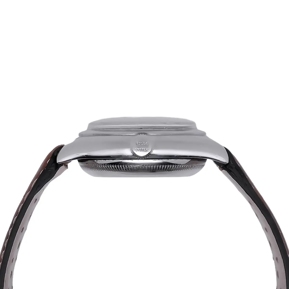 Mit einem Durchmesser von 32 mm repräsentiert dieses Exemplar die klassische Herrengröße der 40er Jahre. Das dreiteilige Oyster-Gehäuse aus Edelstahl verfügt über die charakteristisch verschraubte Krone und den verschraubten Boden, was die Uhr für ihre Zeit extrem widerstandsfähig machte. Das Zifferblatt zeigt eine authentische, altersgemäße Patina, die den Charakter dieses Zeitzeugen unterstreicht.