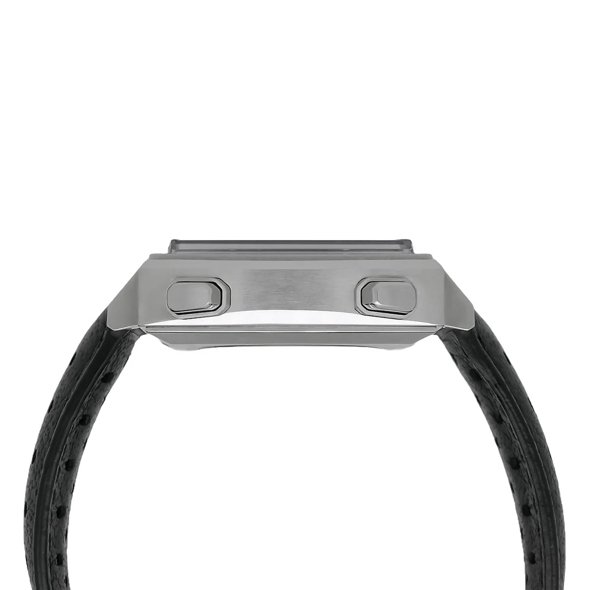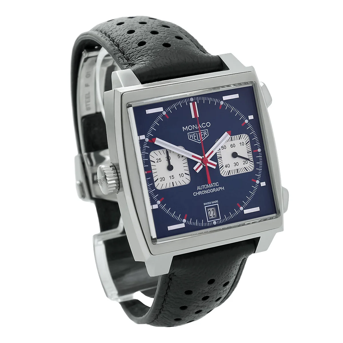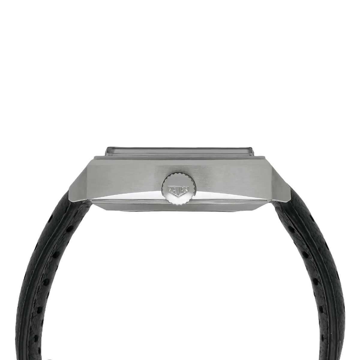 Das charakteristische Quadratgehäuse misst 39 mm im Durchmesser und besteht aus poliertem und satiniertem Edelstahl. Eine markante Eigenschaft dieser Spezifikation ist die linksseitig positionierte Krone, die das technische Layout des ersten Automatik-Chronographen zitiert. Gewölbtes Saphirglas schützt das Zifferblatt, während eine Wasserdichtigkeit von 10 ATM die alltagstaugliche Robustheit gewährleistet. Geschlossen wird die Architektur sicher über eine Faltschließe, die ebenfalls vollständig aus Edelstahl gefertigt ist.