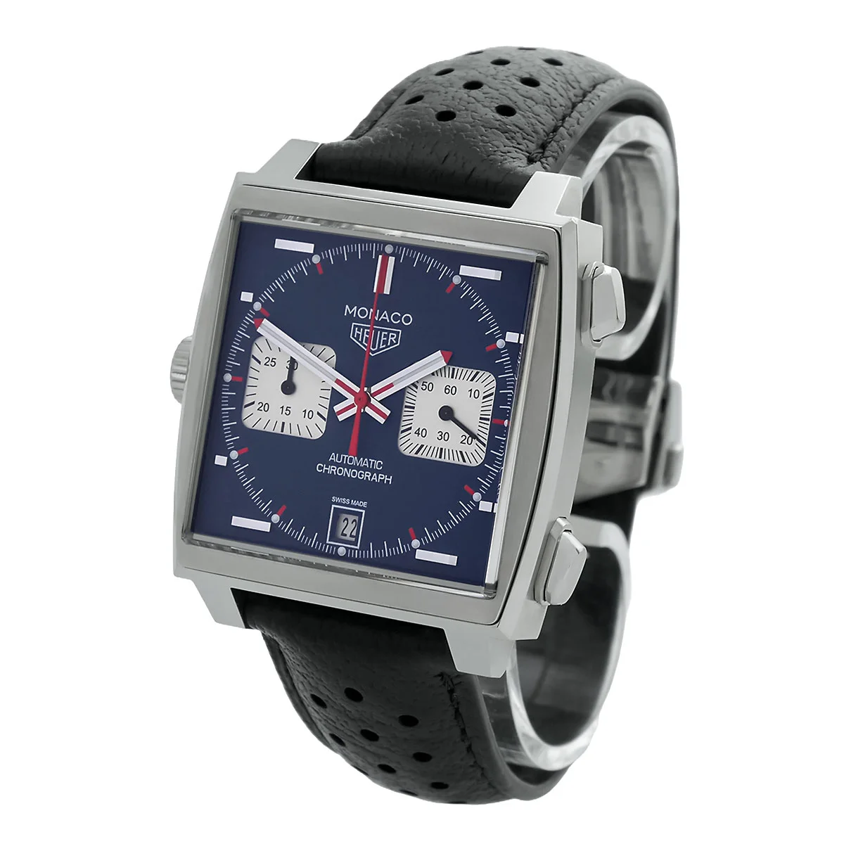 Das Zifferblatt präsentiert sich in einem matten Blau, das von zwei quadratischen, silbernen Hilfszifferblättern bei drei und neun Uhr kontrastiert wird. Rote Akzente auf den Zeigern und Indizes optimieren die visuelle Trennung der Funktionen. Die horizontal applizierten Leuchtindizes und die feine Minuterie auf dem Rehaut unterstützen die schnelle Erfassung von Stoppzeiten. Ein schwarzes Band aus Kalbsleder mit Perforation komplettiert den instrumentellen Motorsport-Charakter dieser Konstruktion.