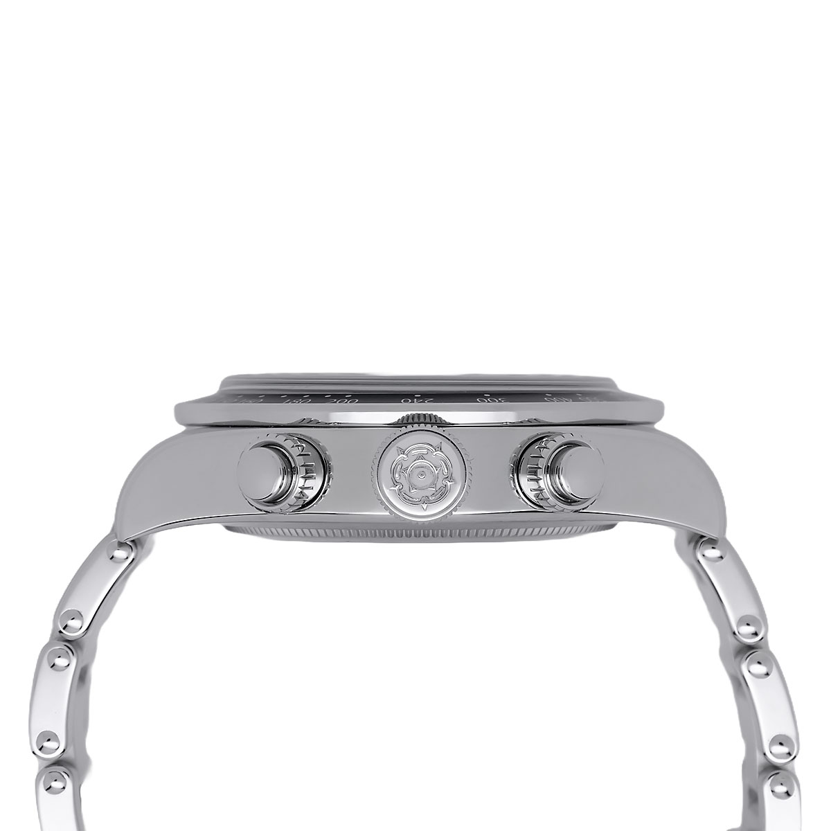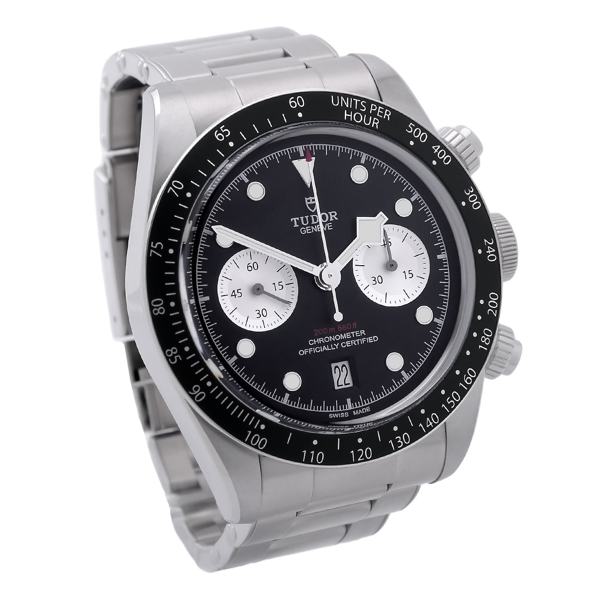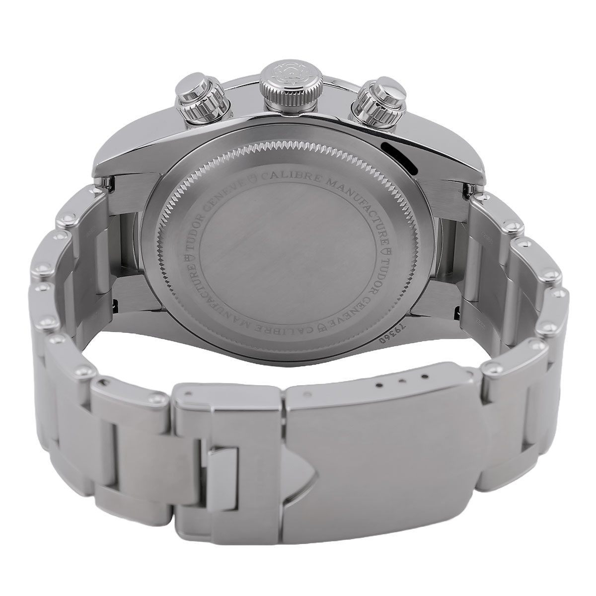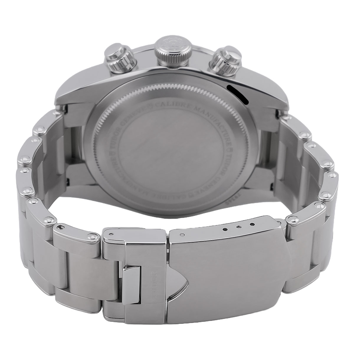 Der Tudor Black Bay Chronograph mit der Referenz M79360N-0011 vereint das maritime Erbe der Black Bay Linie mit der klassischen Motorsport-Historie der Marke. Das 41 mm Gehäuse aus Edelstahl besticht durch seine markante Präsenz und die präzise ausgeführten, polierten Fasen an den Flanken. Das markante Reverse Panda Zifferblatt – mattschwarz mit kontrastierenden, silbernen Totalisatoren – sorgt für eine exzellente Ablesbarkeit und wird von einer feststehenden Edelstahllünette mit schwarzem Aluminium-Zahlenscheibe und Tachymeterskala eingerahmt. Die verschraubten Drücker, inspiriert von der ersten Generation der Tudor Chronographen, sowie die großzügig dimensionierte Krone garantieren eine Wasserdichtigkeit bis 200 Meter. Da es sich um ein NOS (New Old Stock) Exemplar handelt, befindet sich die Uhr in einem makellosen, ungetragenen Zustand ohne jegliche Spuren an Gehäuse oder Band.