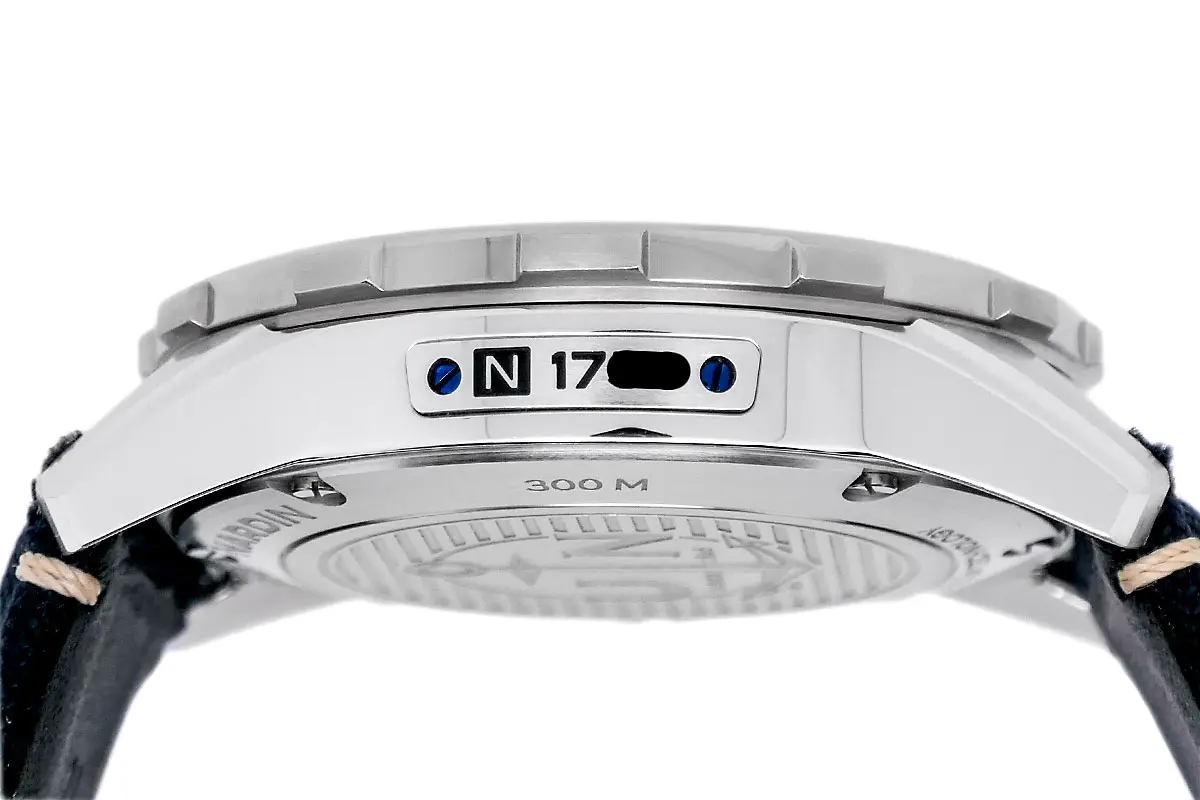 Das robuste Gehäuse aus massivem Edelstahl misst 42 mm im Durchmesser und wurde für anspruchsvolle Druckverhältnisse konzipiert. Eine Wasserdichtigkeit von 30 ATM wird durch den verschraubten Gehäuseboden sowie die stark geriffelte, verschraubte Krone sichergestellt. Die einseitig drehbare Taucherlünette mit markanter Relief-Einlage dient der präzisen Zeiterfassung unter Wasser. Die Flanken und Oberflächen des Edelstahls weisen eine aufwendige Bearbeitung mit abwechselnd satinierten und polierten Finissierungen auf.